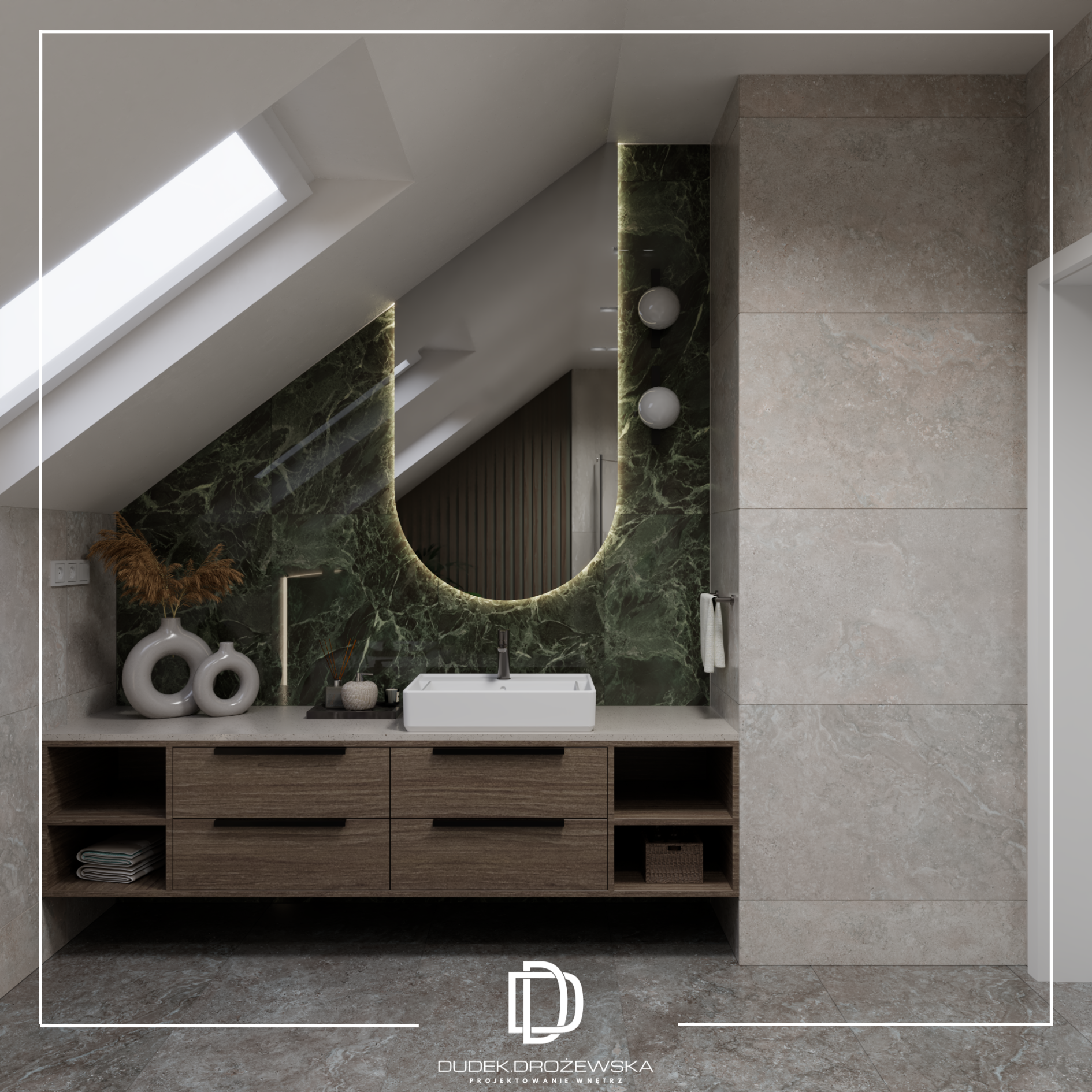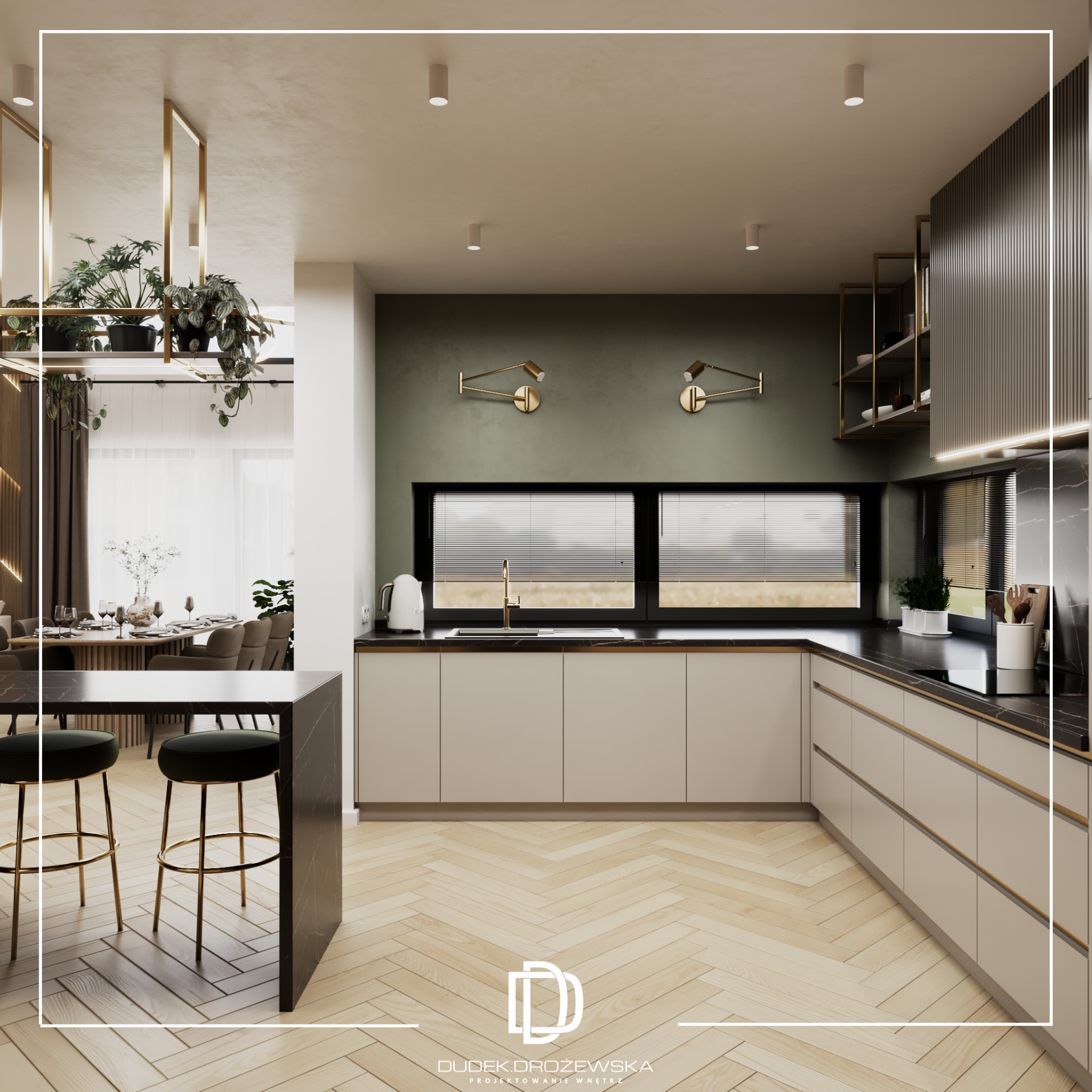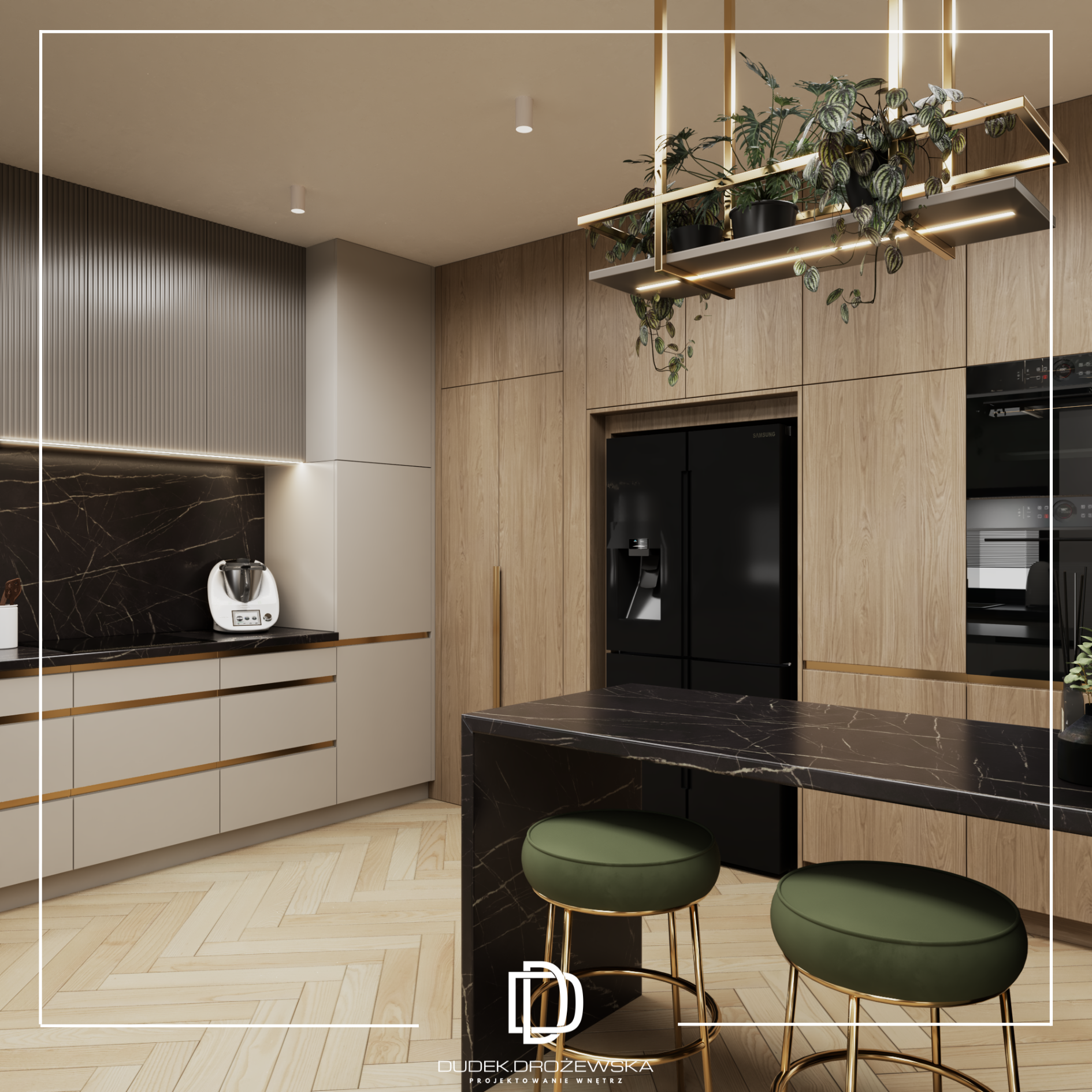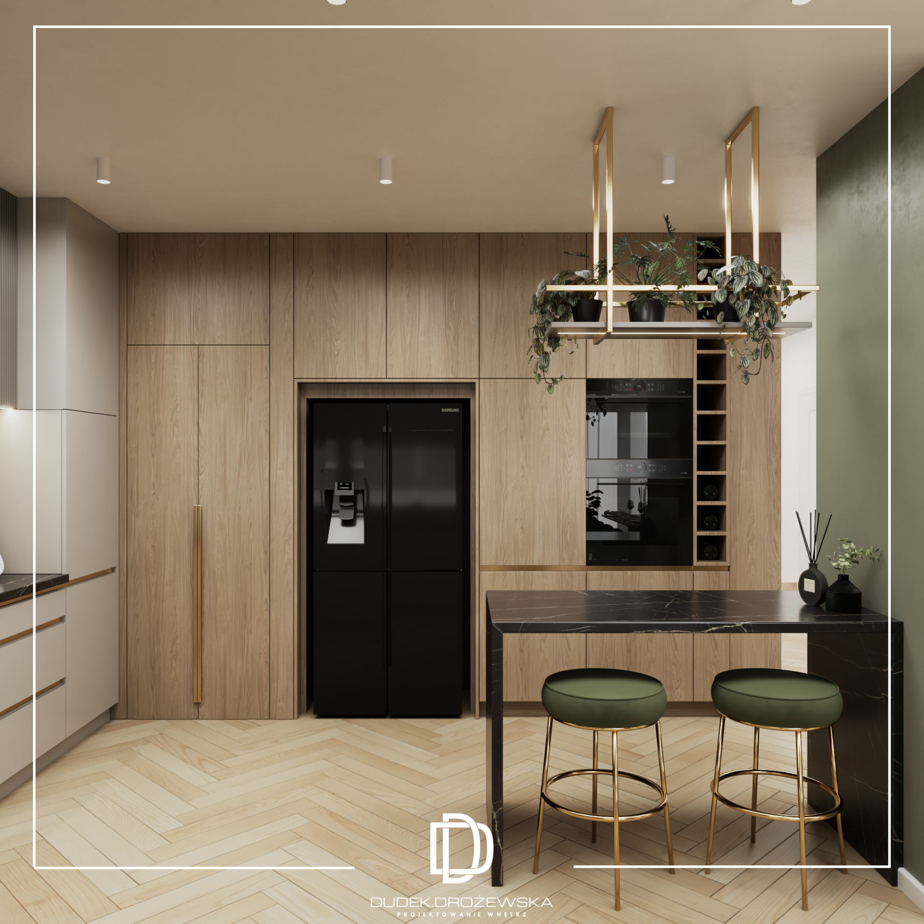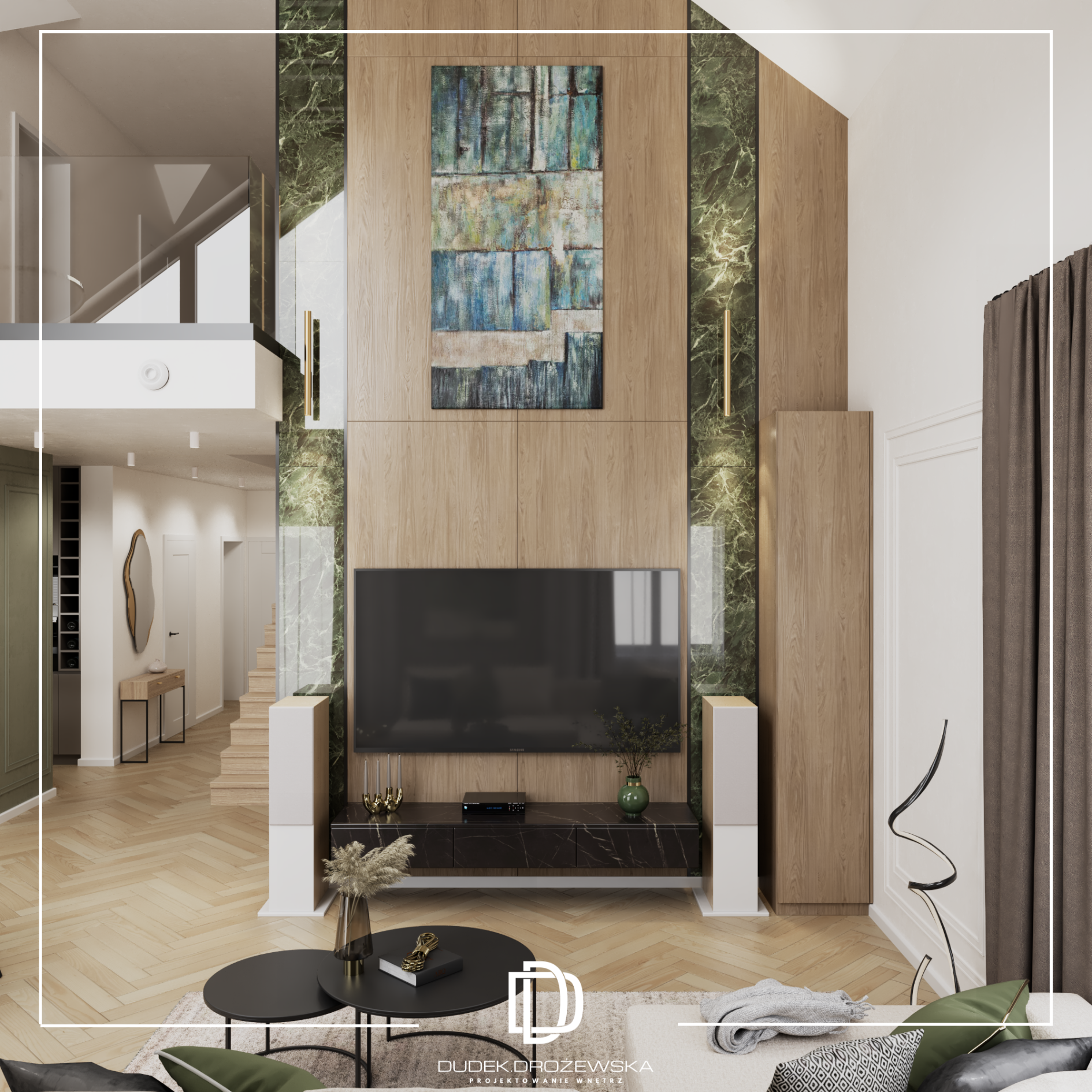 Kolorystyka opiera się na spokojnych beżach, ciepłych brązach i jasnym drewnie, przełamanych głęboką zielenią kamienia oraz czarnymi detalami. Zieleń pojawia się jako mocniejszy akcent – w łazience i strefie dziennej – dodając wnętrzu charakteru i elegancji. Całość uzupełniają subtelne złote elementy i liniowe oświetlenie LED, które podkreśla piony i strukturę ścian.