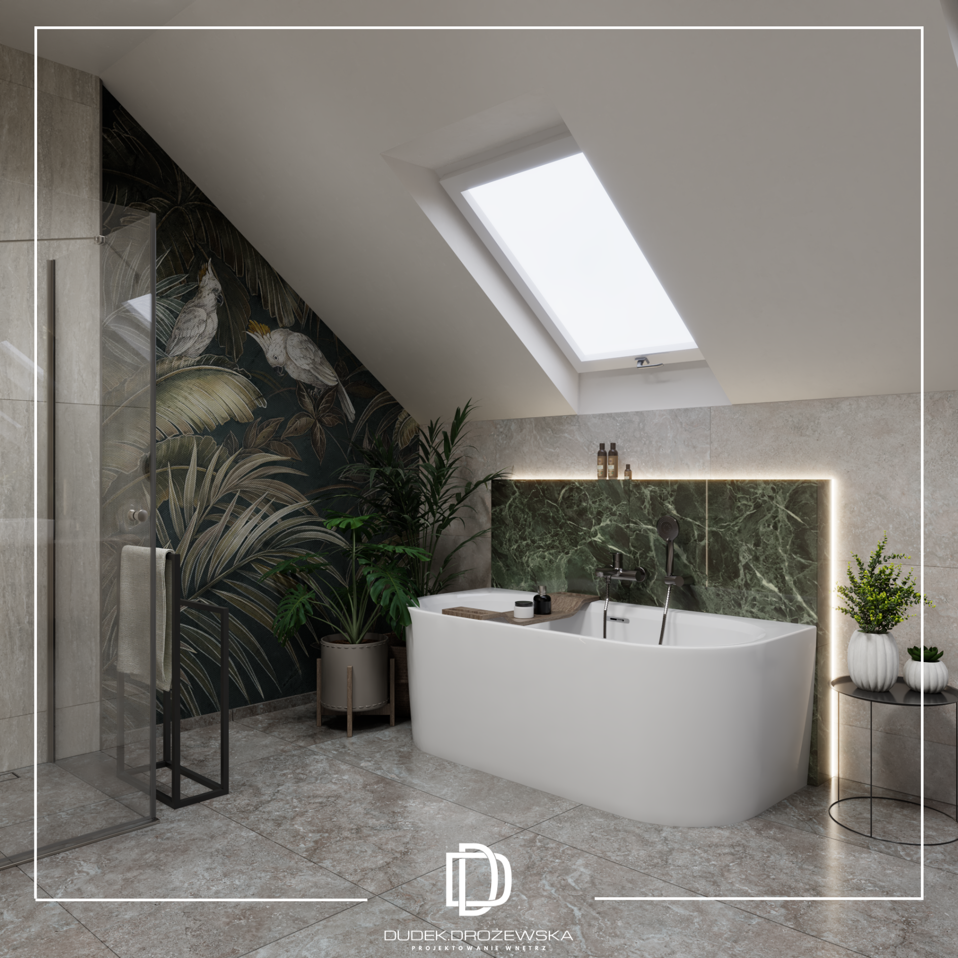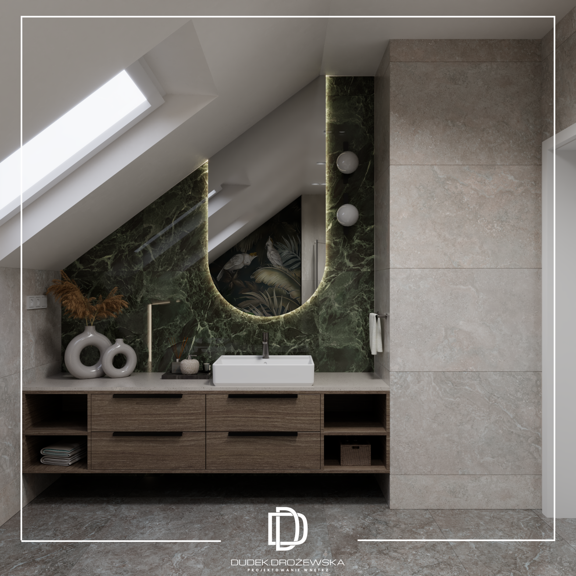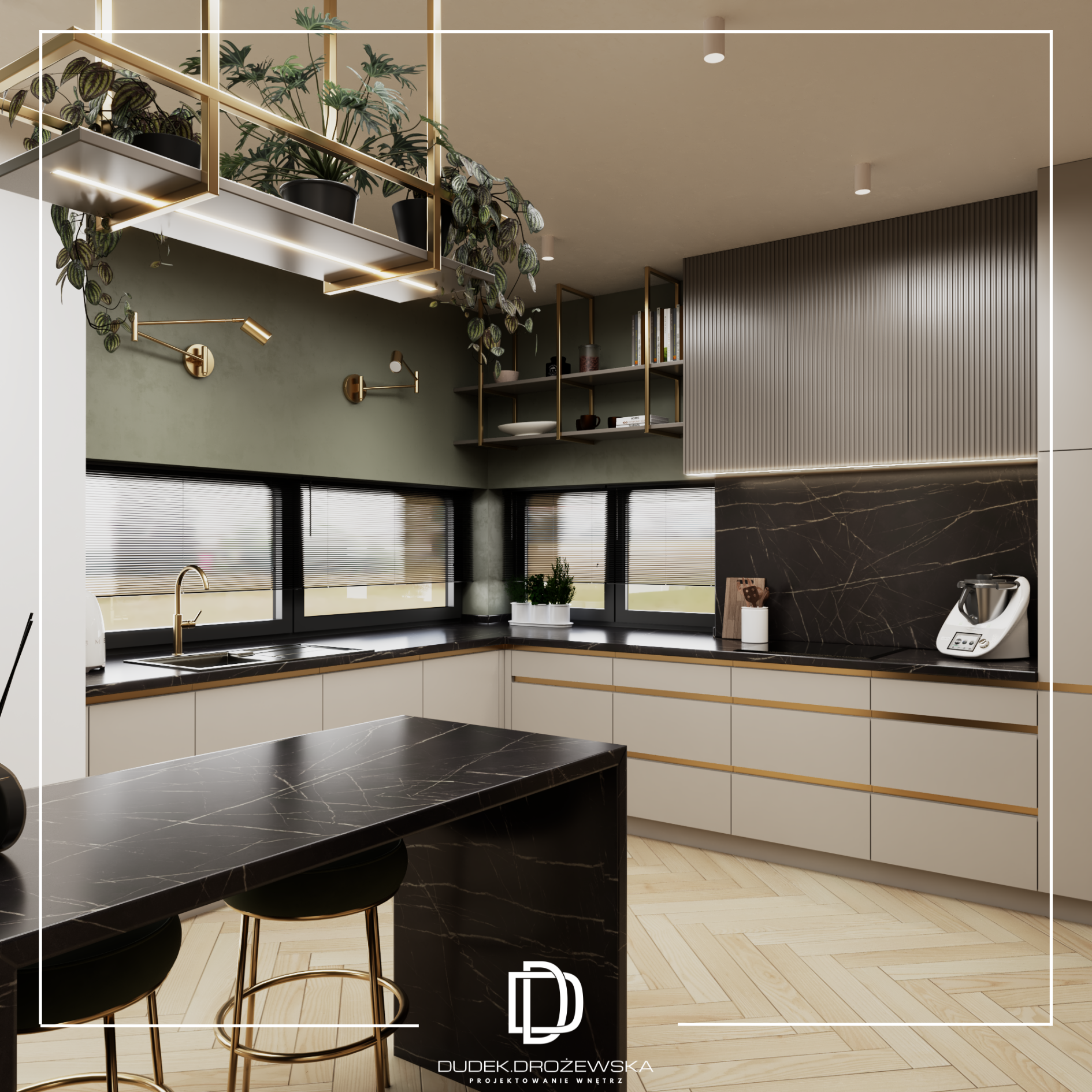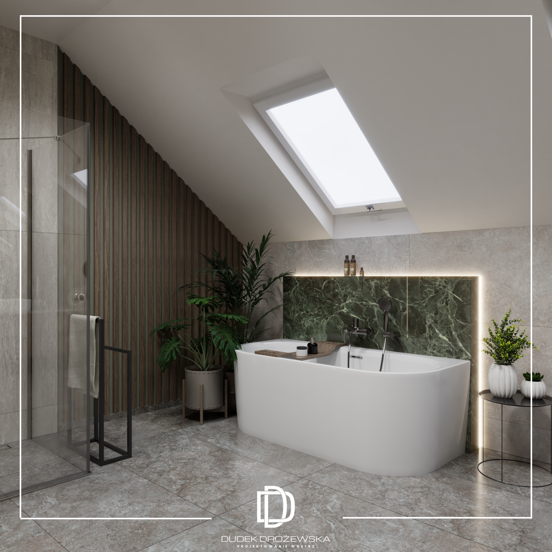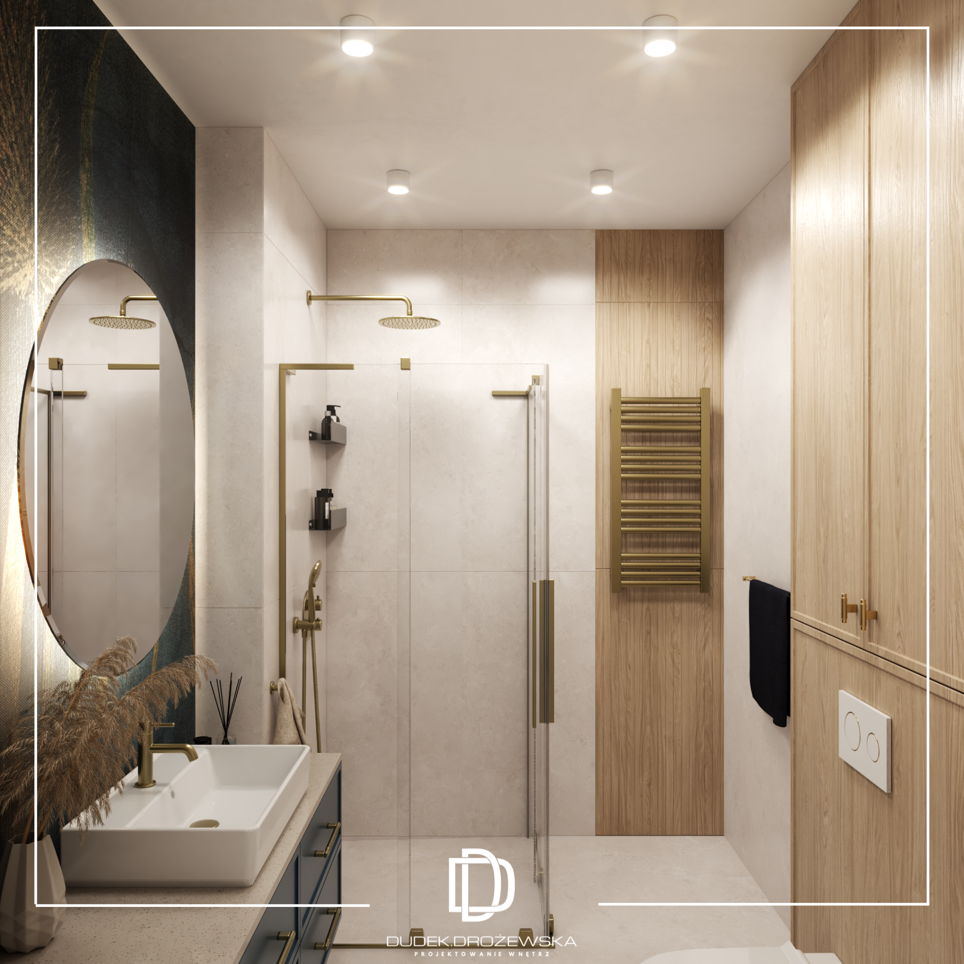 Kolorystyka opiera się na spokojnych beżach, ciepłych brązach i jasnym drewnie, przełamanych głęboką zielenią kamienia oraz czarnymi detalami. Zieleń pojawia się jako mocniejszy akcent – w łazience i strefie dziennej – dodając wnętrzu charakteru i elegancji. Całość uzupełniają subtelne złote elementy i liniowe oświetlenie LED, które podkreśla piony i strukturę ścian.