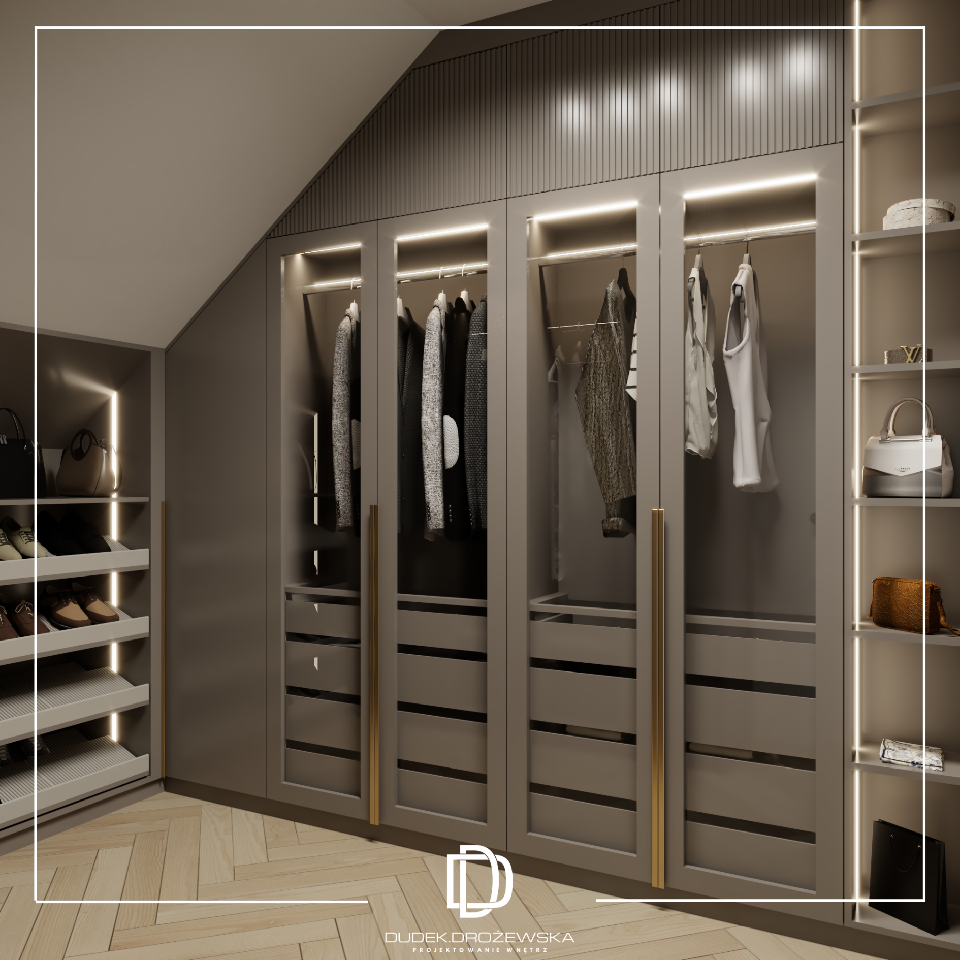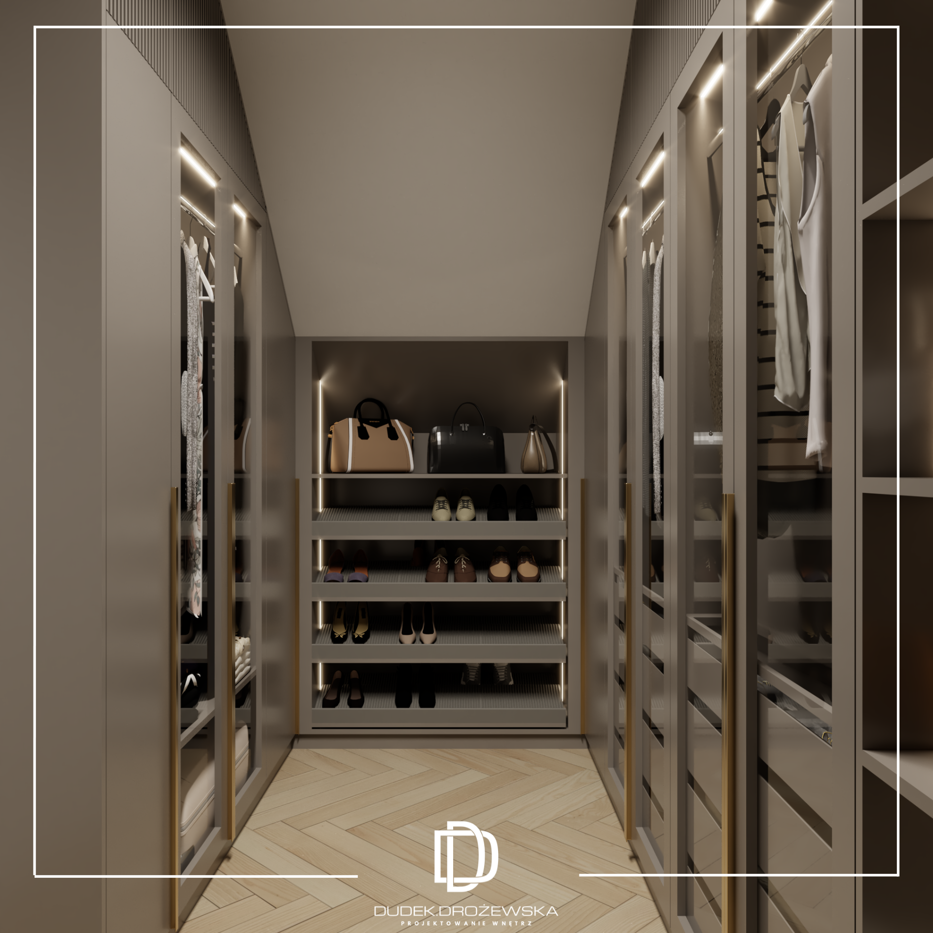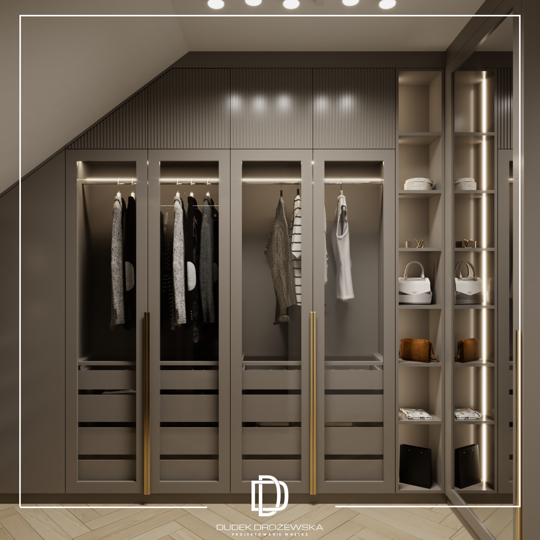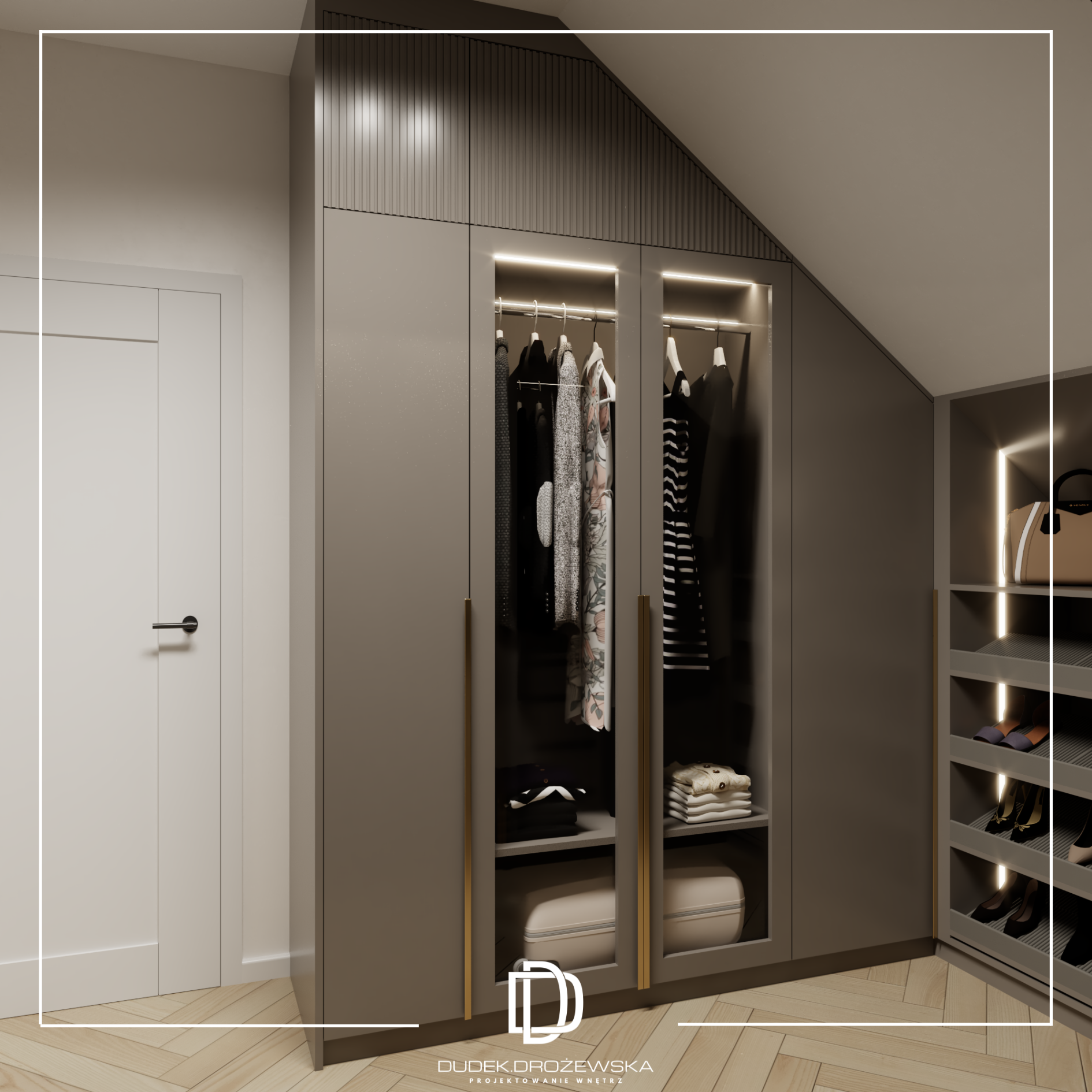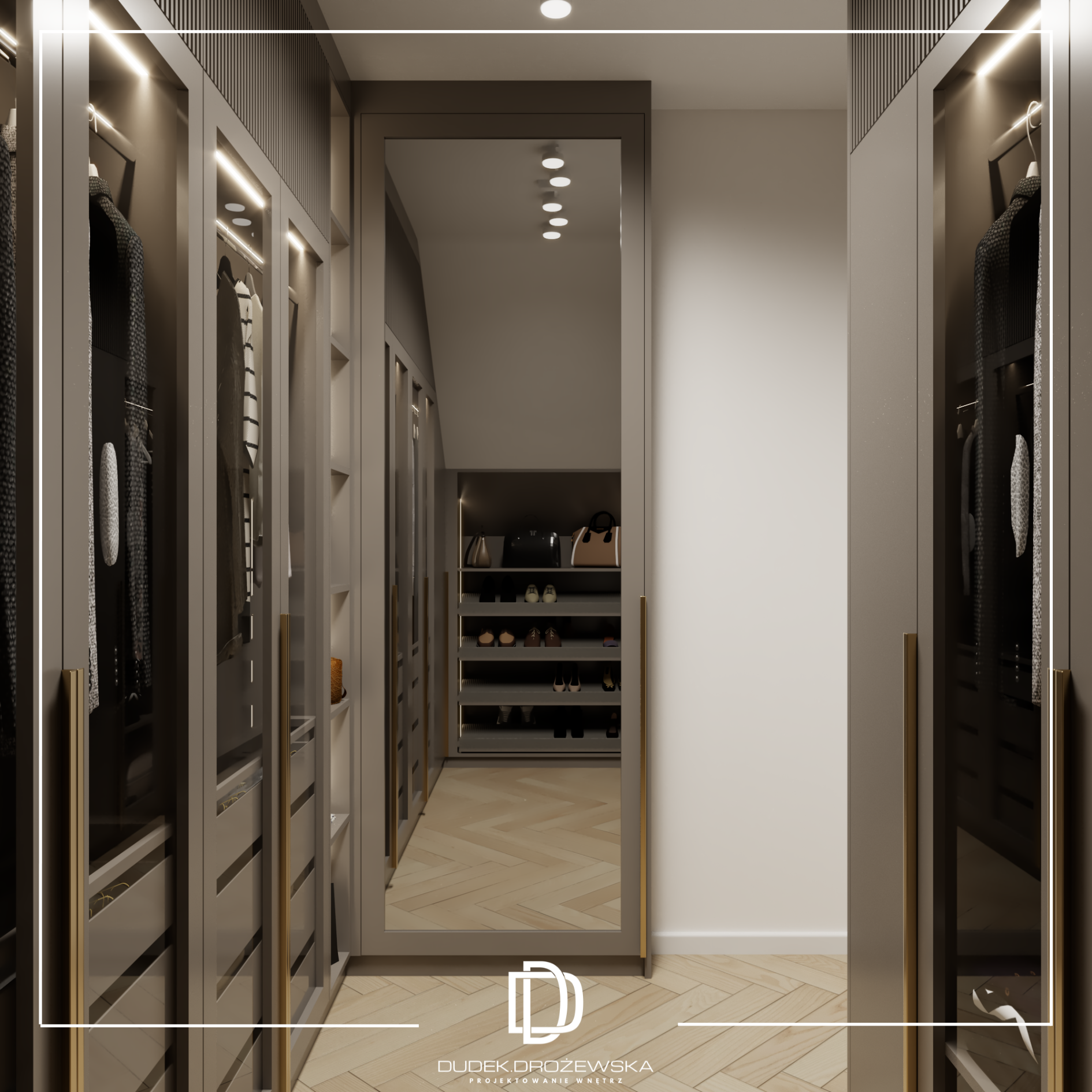 Kolorystyka opiera się na spokojnych beżach, ciepłych brązach i jasnym drewnie, przełamanych głęboką zielenią kamienia oraz czarnymi detalami. Zieleń pojawia się jako mocniejszy akcent – w łazience i strefie dziennej – dodając wnętrzu charakteru i elegancji. Całość uzupełniają subtelne złote elementy i liniowe oświetlenie LED, które podkreśla piony i strukturę ścian.
