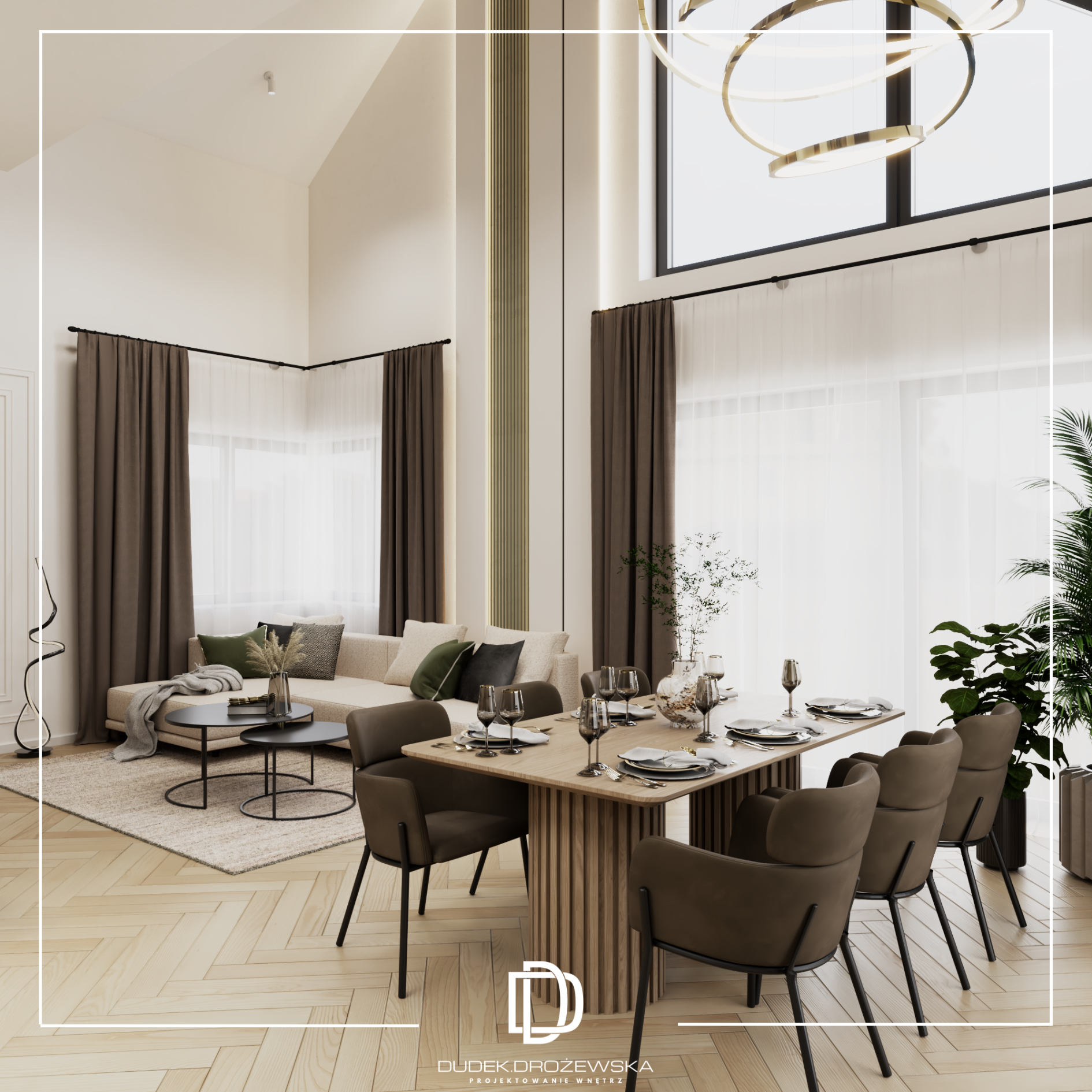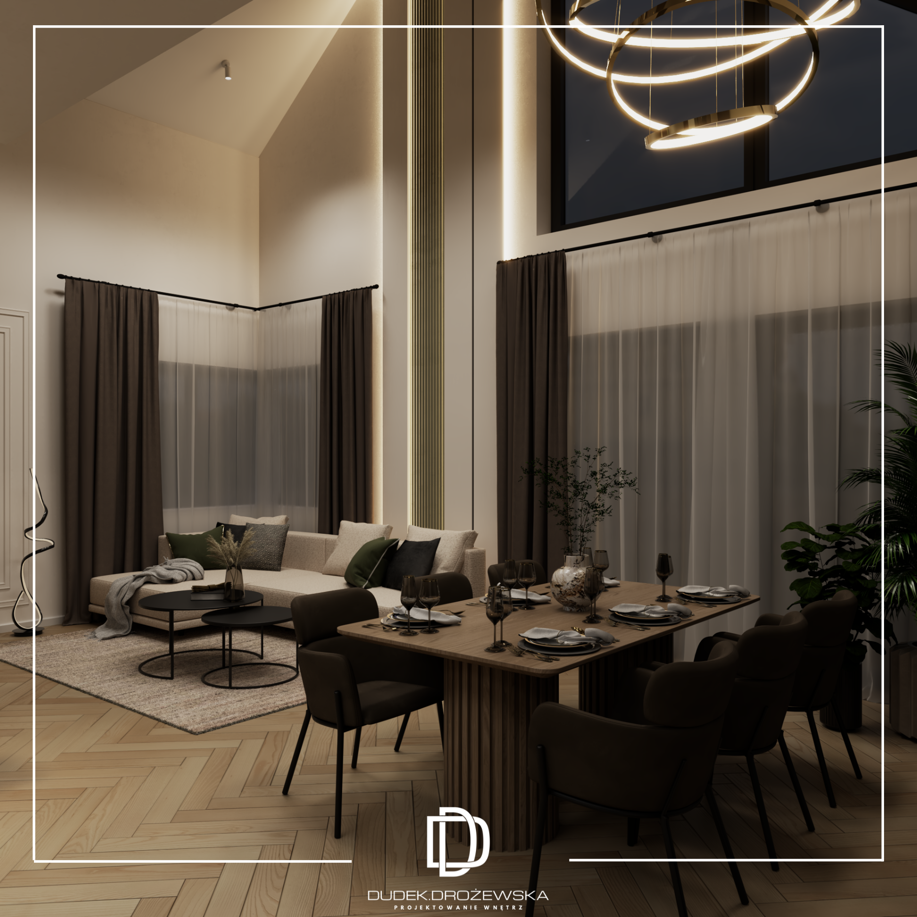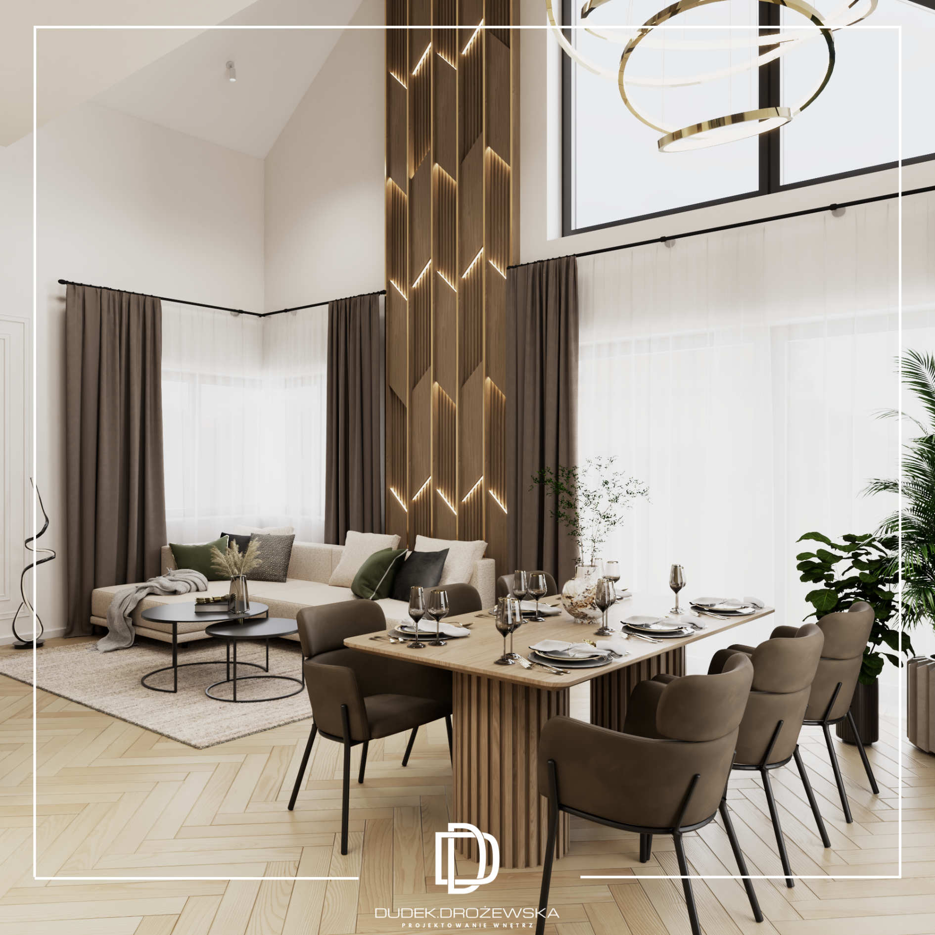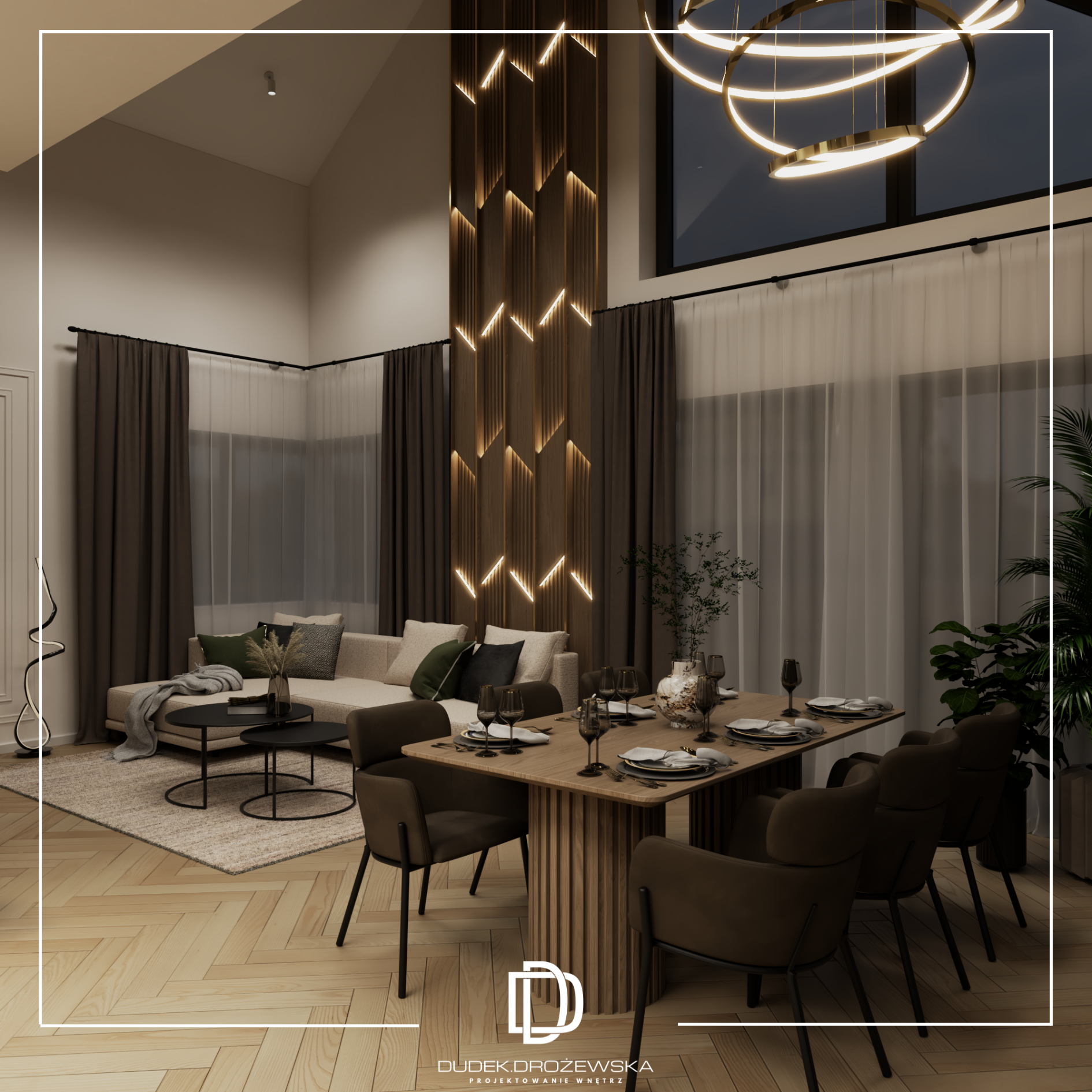 Ten projekt to nowoczesna, elegancka przestrzeń z wyraźnym akcentem naturalnych materiałów i światła. Bazą jest minimalistyczna forma, ale ocieplona drewnem, miękkimi tkaninami i nastrojowym oświetleniem, które buduje klimat szczególnie wieczorem.