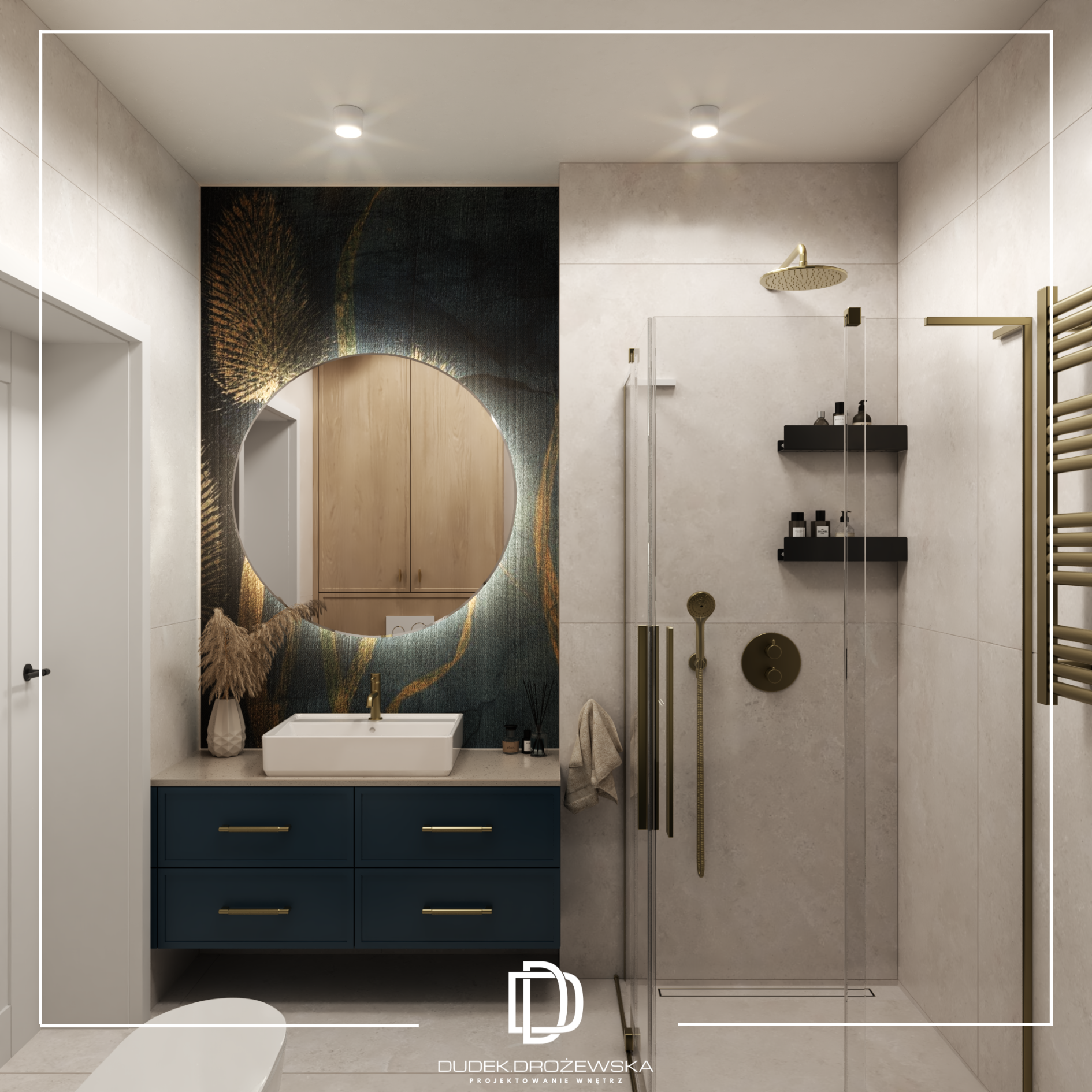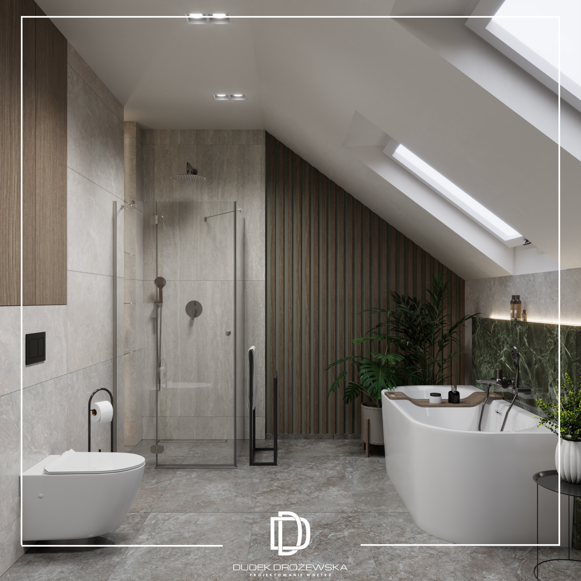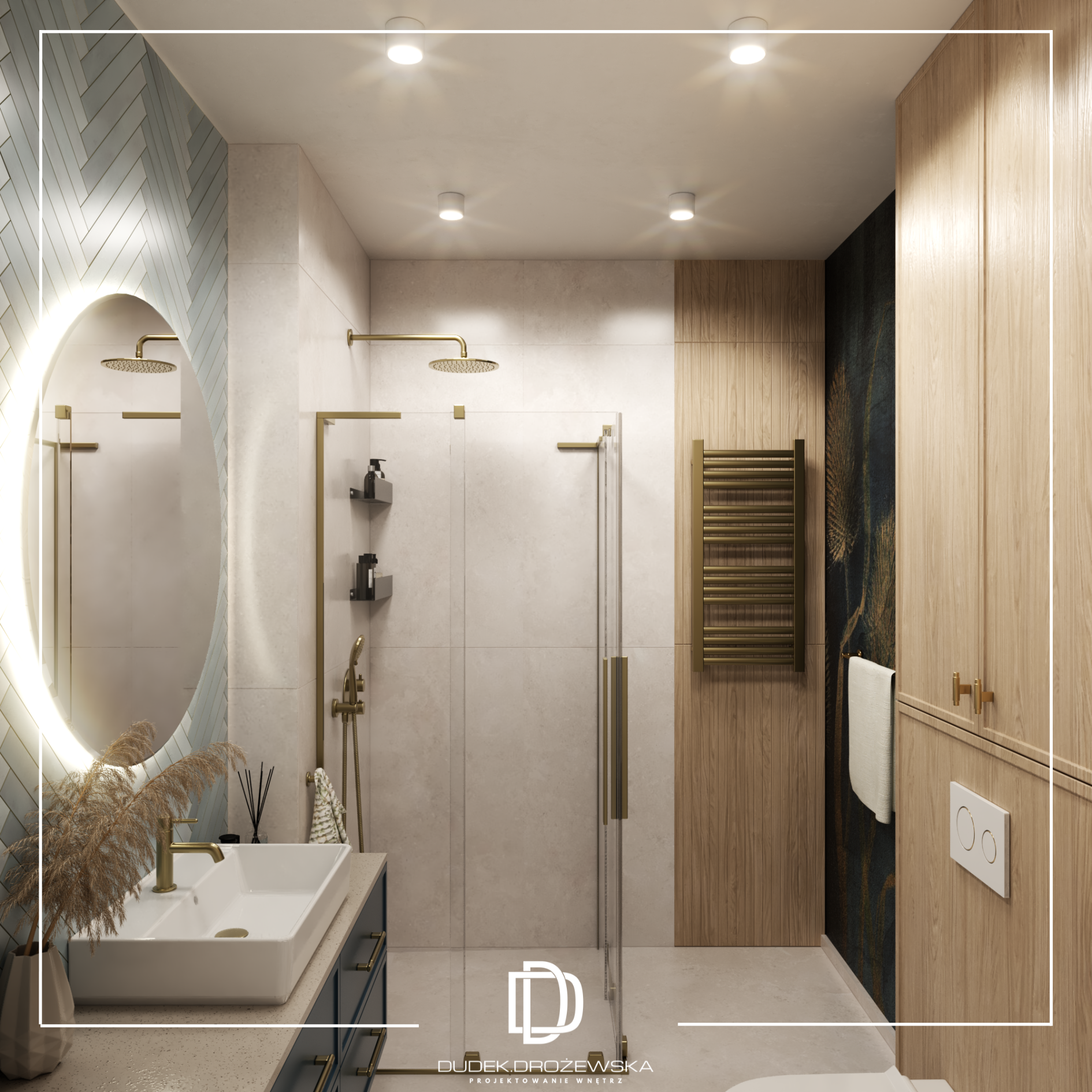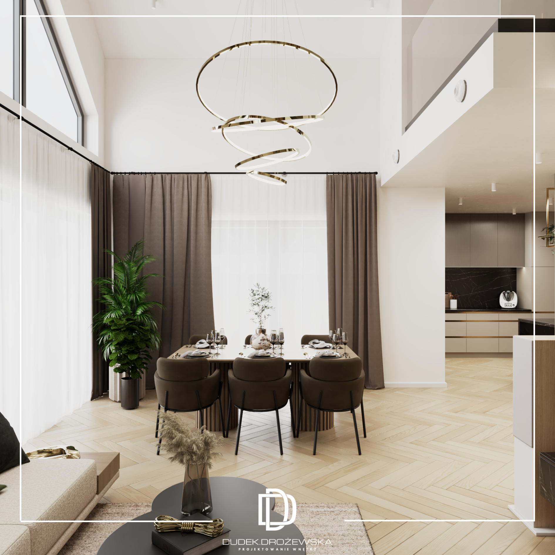 Ten projekt to nowoczesna, elegancka przestrzeń z wyraźnym akcentem naturalnych materiałów i światła. Bazą jest minimalistyczna forma, ale ocieplona drewnem, miękkimi tkaninami i nastrojowym oświetleniem, które buduje klimat szczególnie wieczorem.