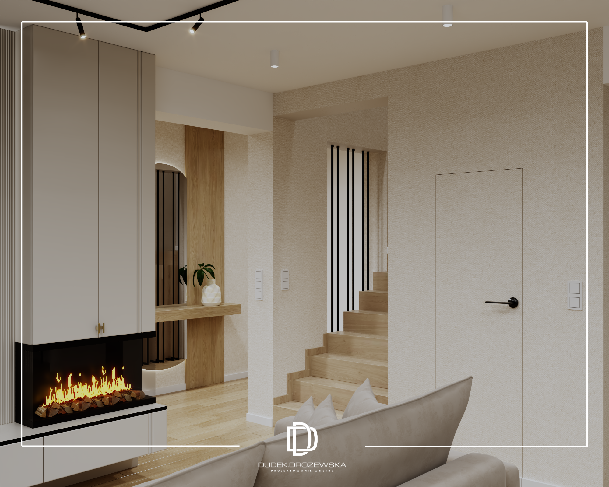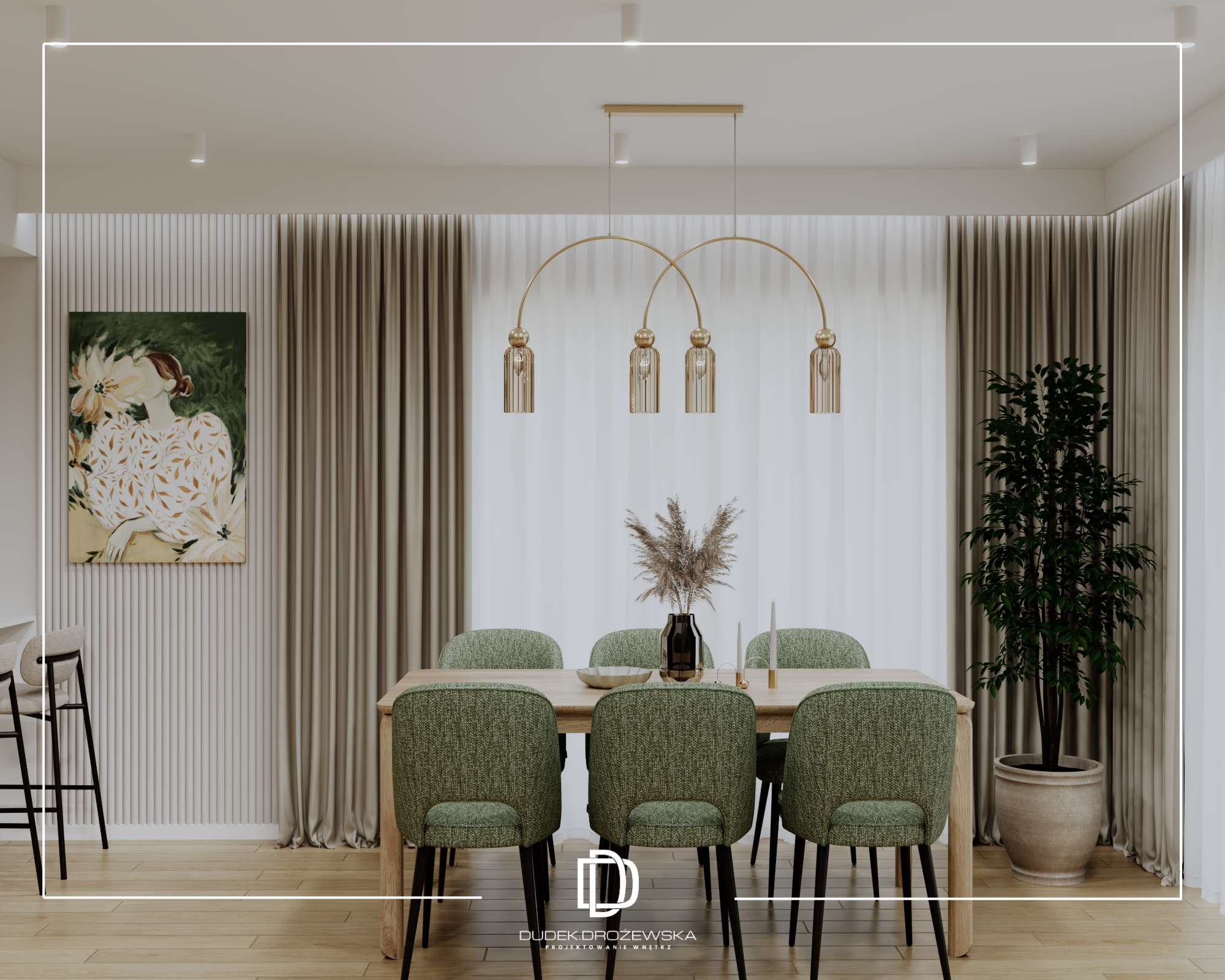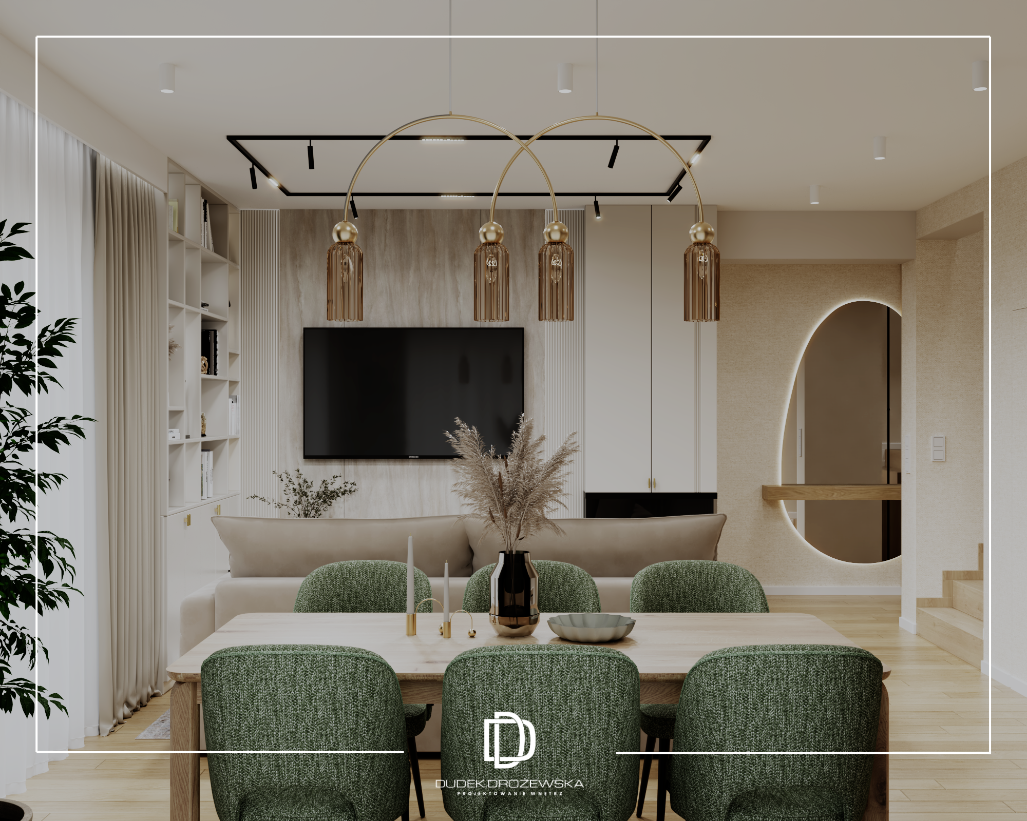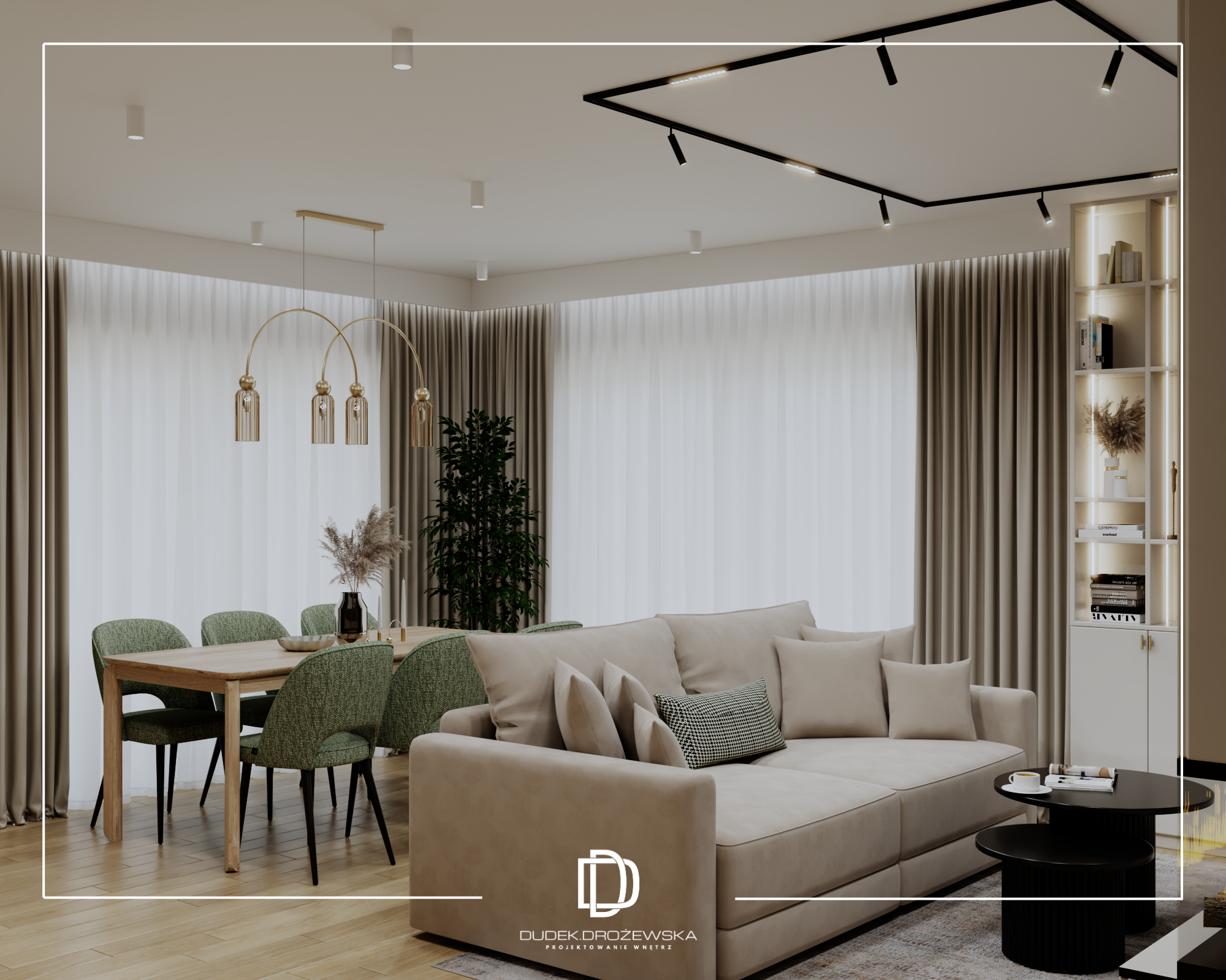 To wnętrze łączy nowoczesną prostotę z elegancją inspirowaną stylem soft modern. Jasna, neutralna baza została ocieplona naturalnym drewnem oraz tkaninami w odcieniach beżu i oliwkowej zieleni, co wprowadza spokojny, domowy klimat. Charakterystycznym elementem są subtelne detale w kolorze złota oraz czarne akcenty oświetlenia, które nadają przestrzeni wyrazistości.