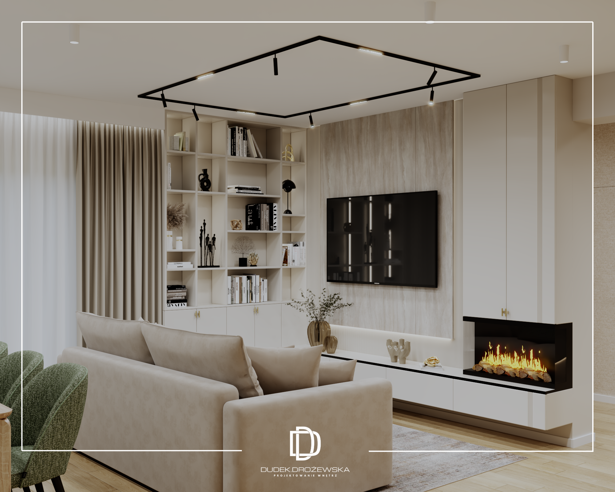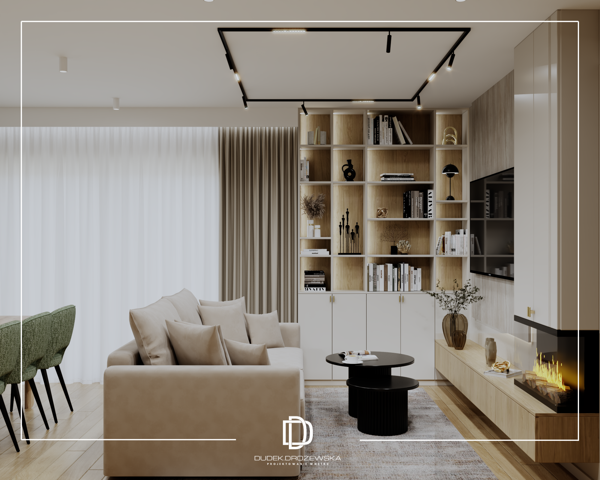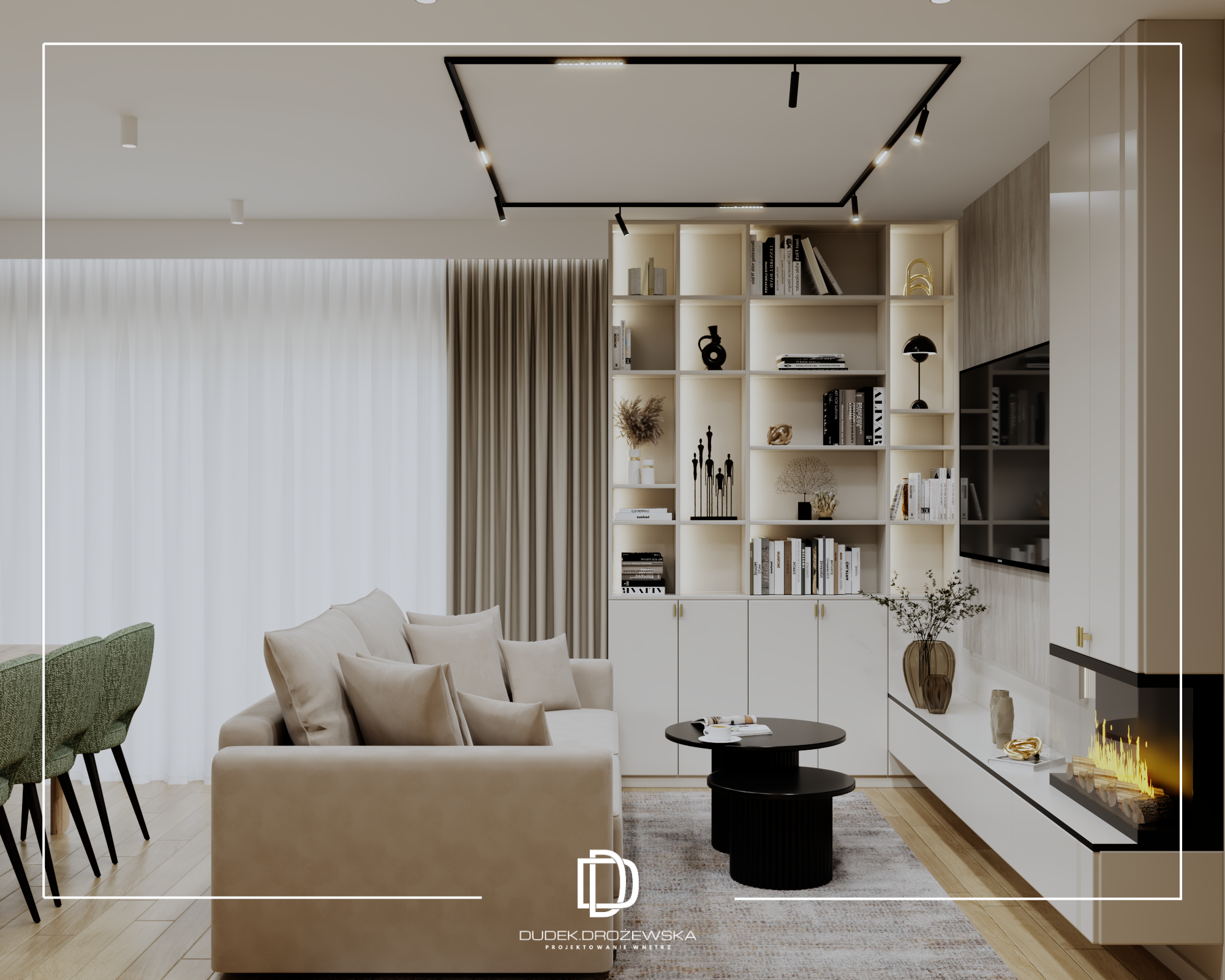 Zabudowa meblowa jest lekka wizualnie, a jednocześnie funkcjonalna – otwarte półki z podświetleniem eksponują dekoracje i książki, budując przytulną atmosferę strefy dziennej. Całość dopełniają miękkie zasłony, tapicerowane krzesła oraz proste, geometryczne formy mebli.