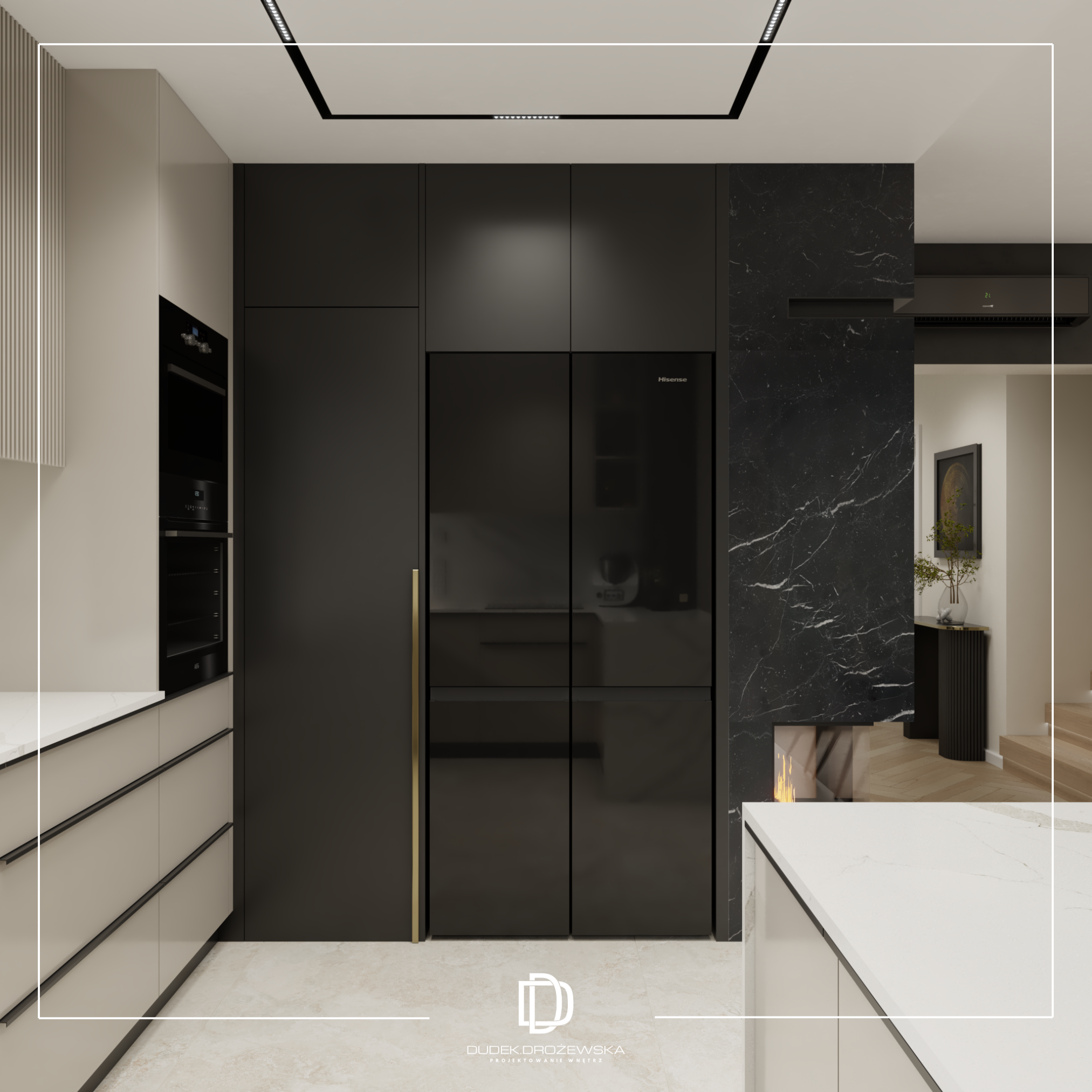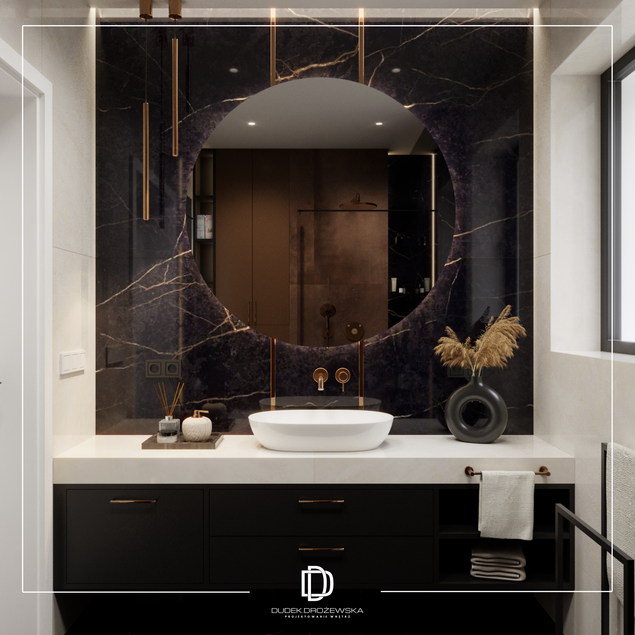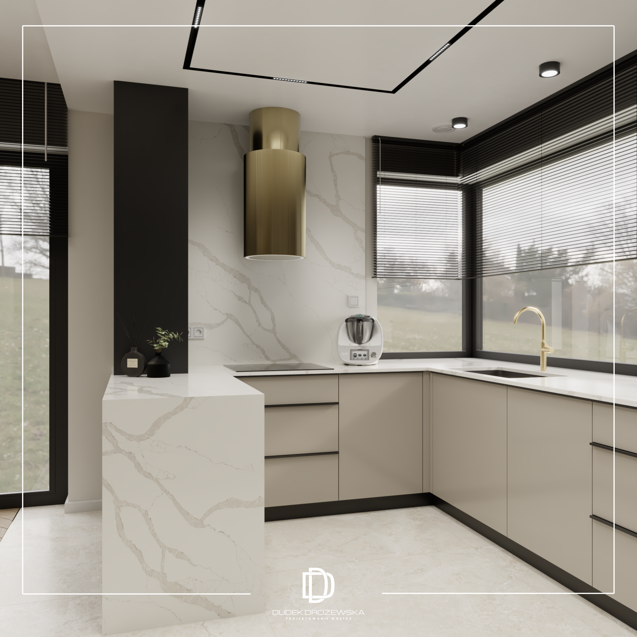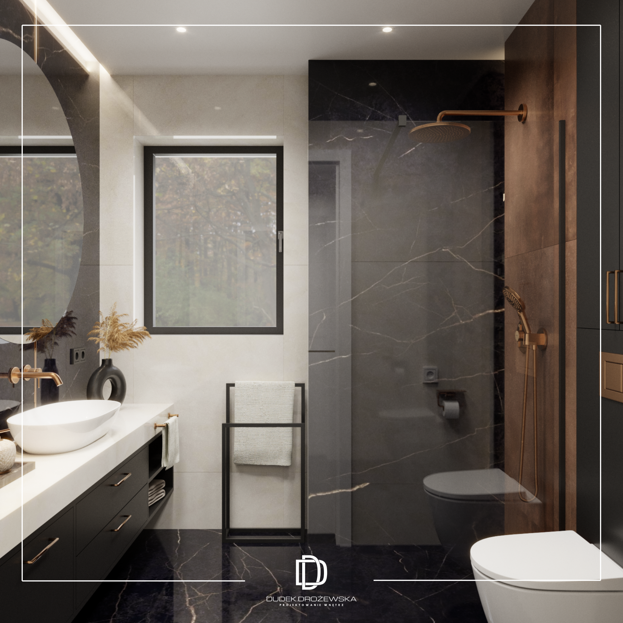 Kolorystycznie wszystko kręci się wokół kontrastu: głęboka czerń (zabudowy, kamień, dodatki) zestawiona z ciepłą bielą i beżem. Do tego dochodzą akcenty złota i miedzi w armaturze i oświetleniu, które dodają elegancji i lekko „hotelowego” klimatu. Duże przeszklenia i jasne powierzchnie sprawiają, że przestrzeń jest lekka mimo mocnych, ciemnych elementów.