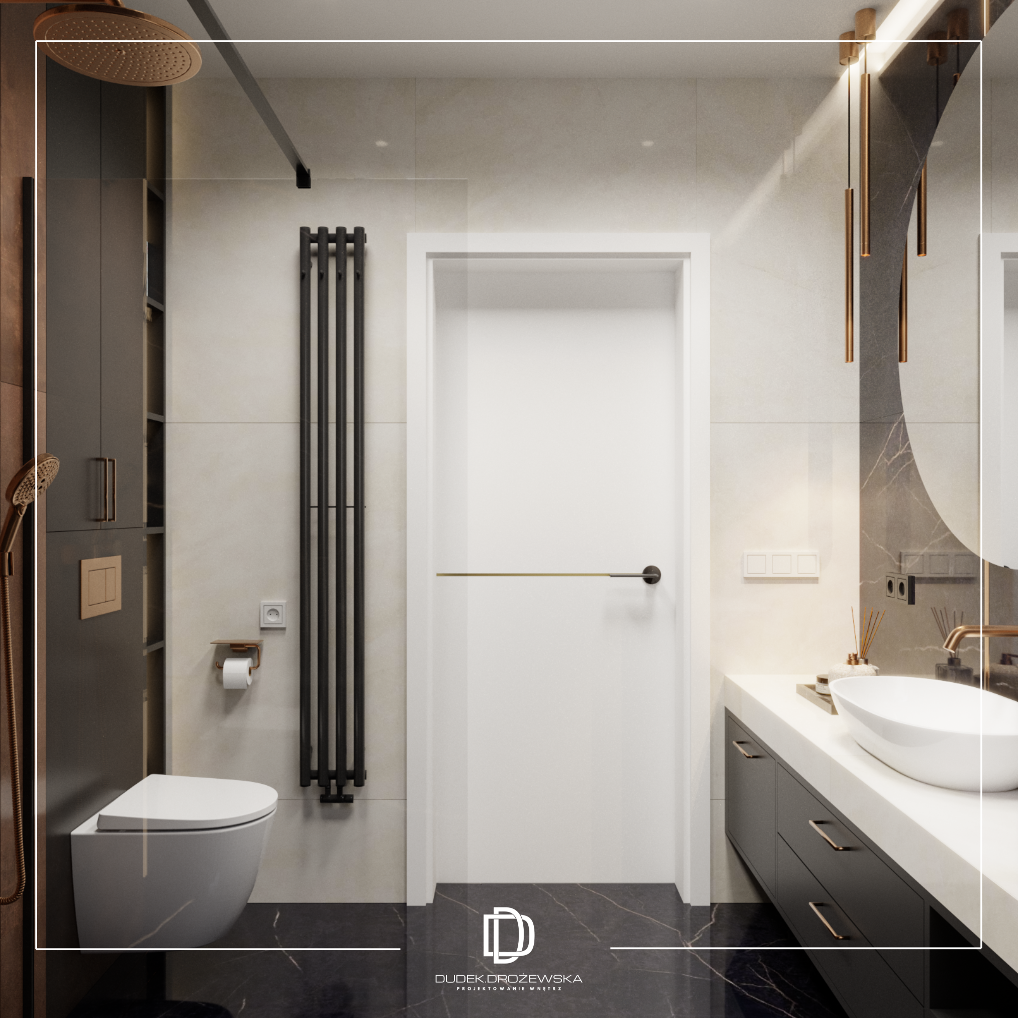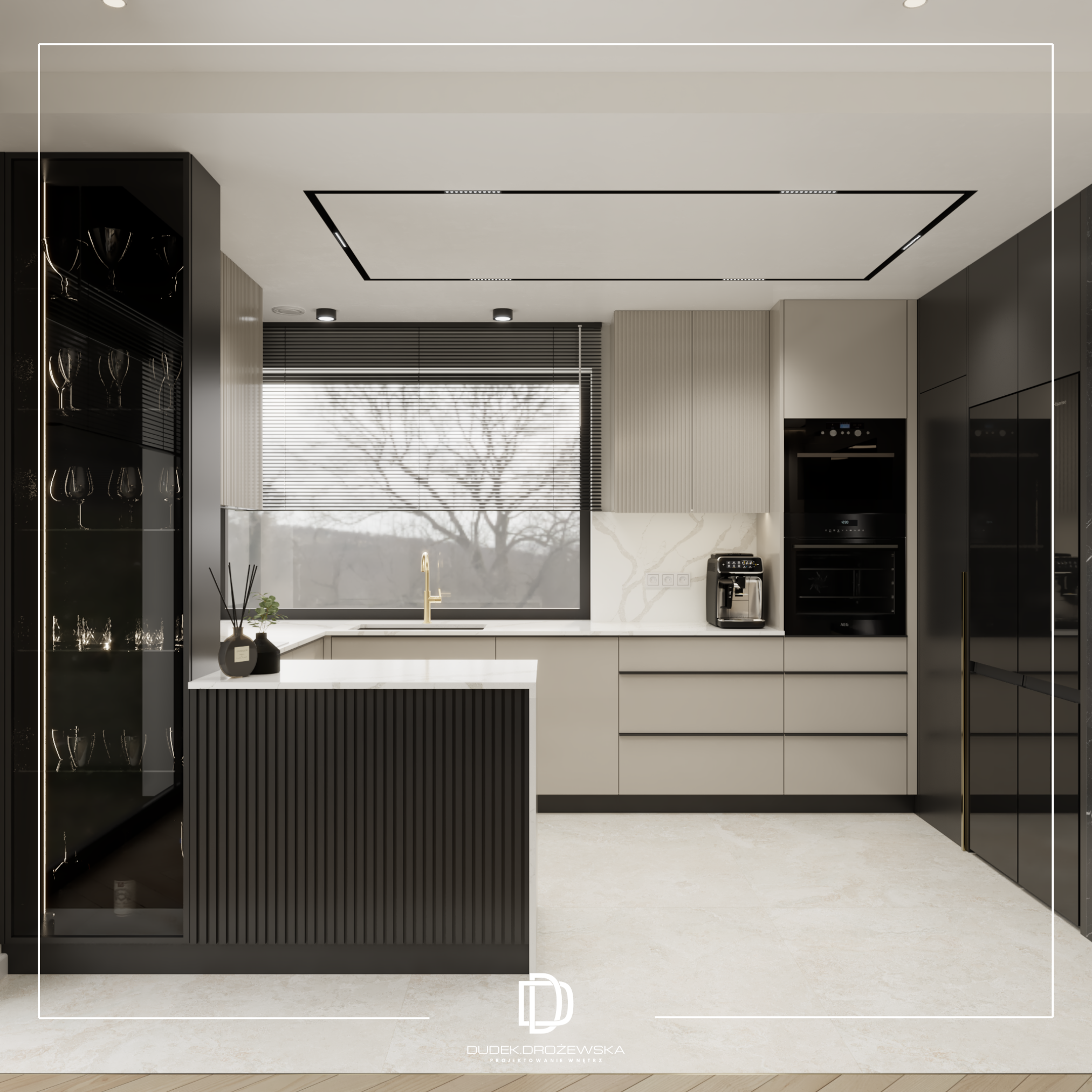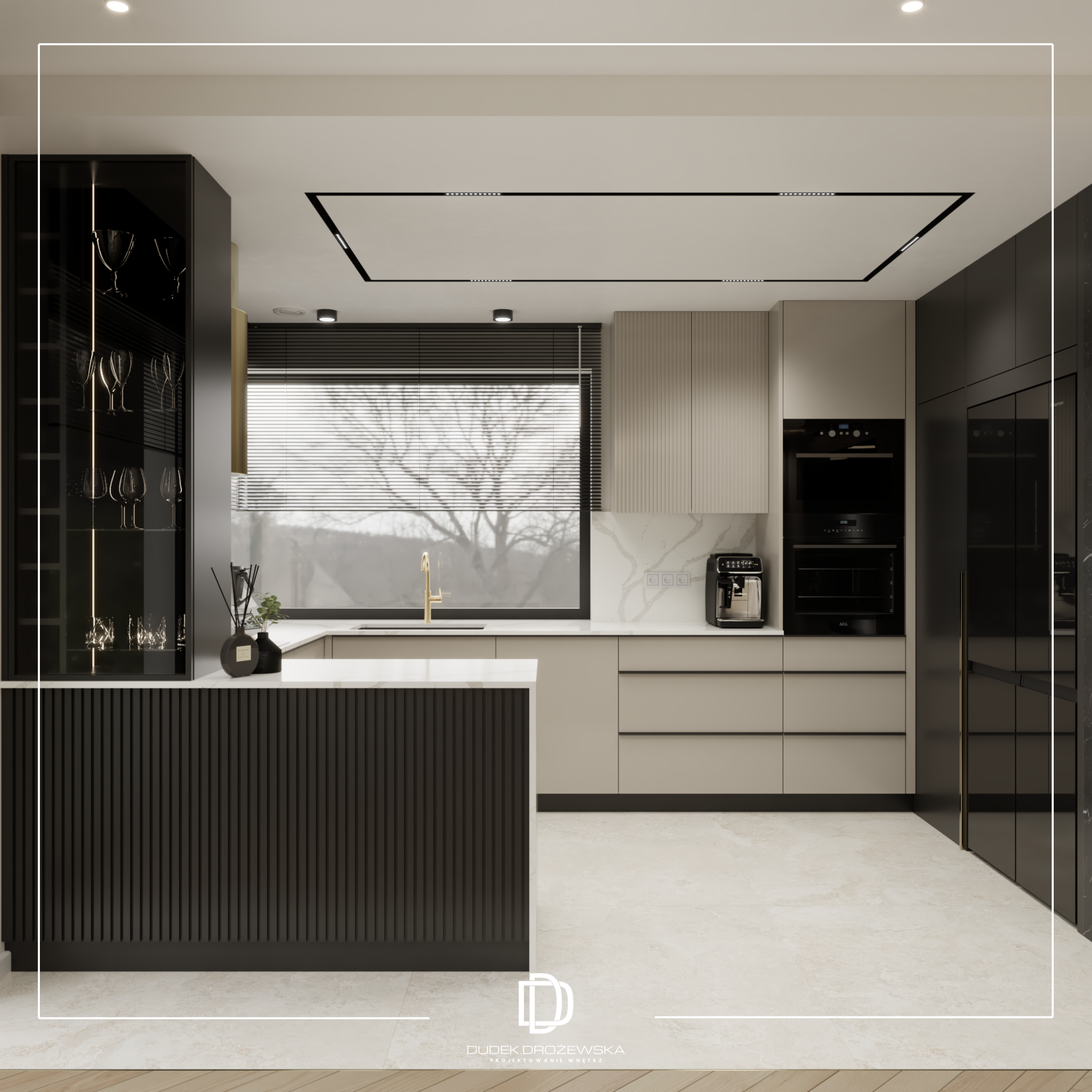 Kolorystycznie wszystko kręci się wokół kontrastu: głęboka czerń (zabudowy, kamień, dodatki) zestawiona z ciepłą bielą i beżem. Do tego dochodzą akcenty złota i miedzi w armaturze i oświetleniu, które dodają elegancji i lekko „hotelowego” klimatu. Duże przeszklenia i jasne powierzchnie sprawiają, że przestrzeń jest lekka mimo mocnych, ciemnych elementów.