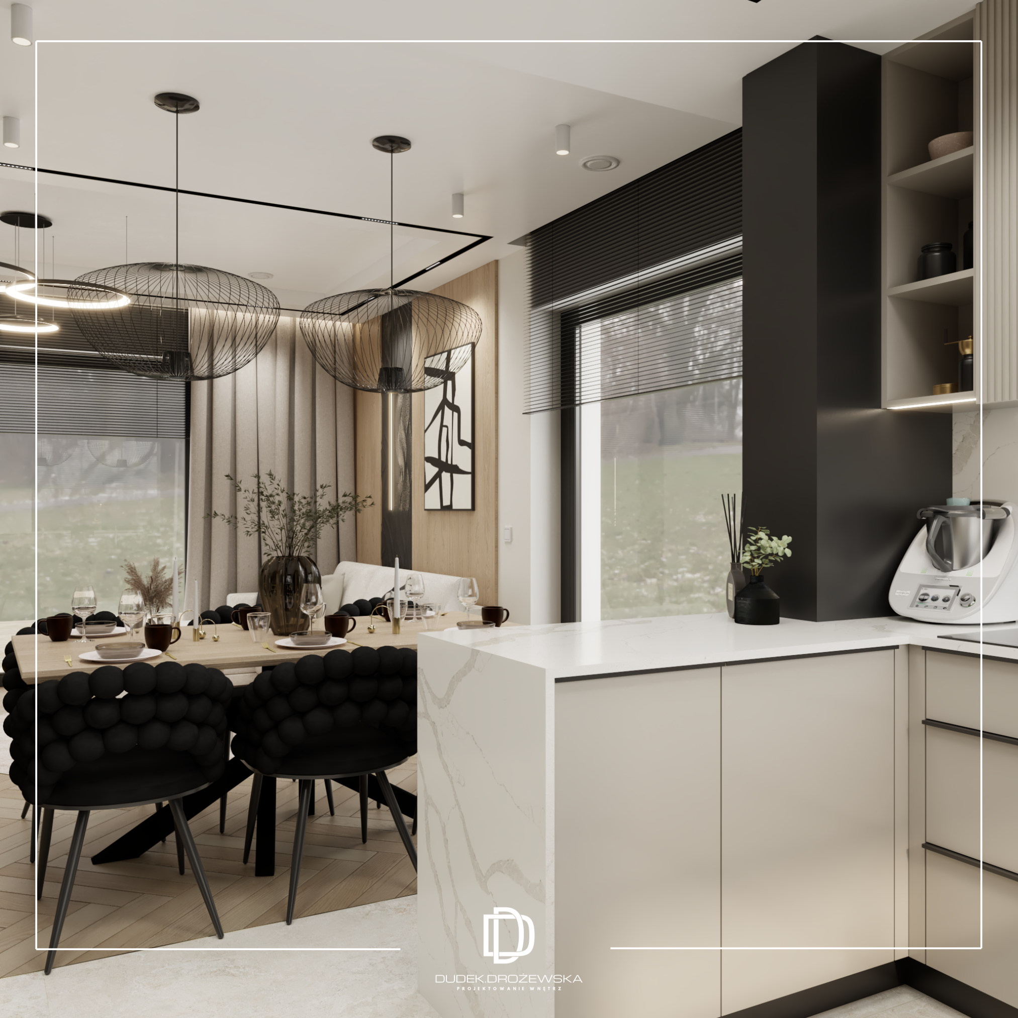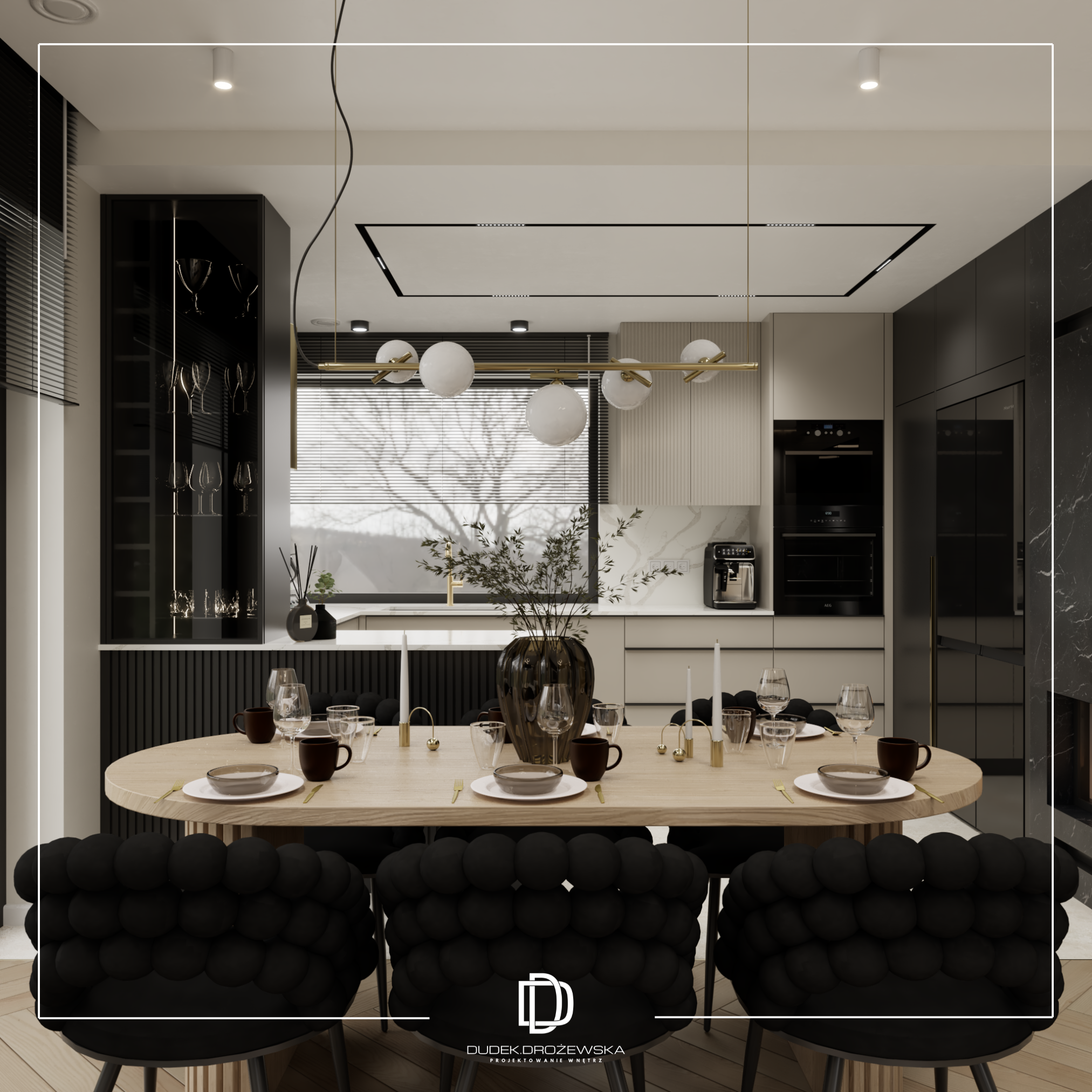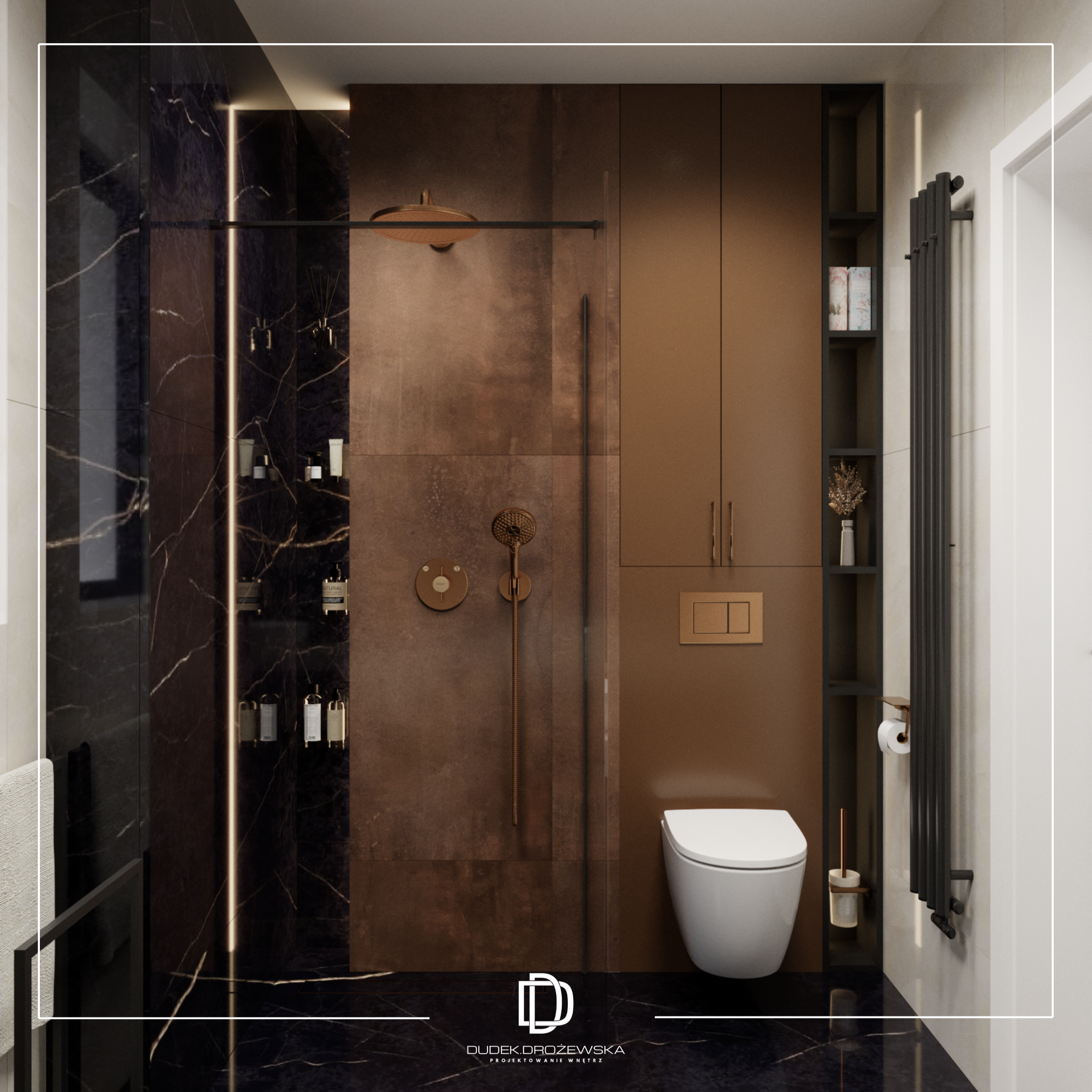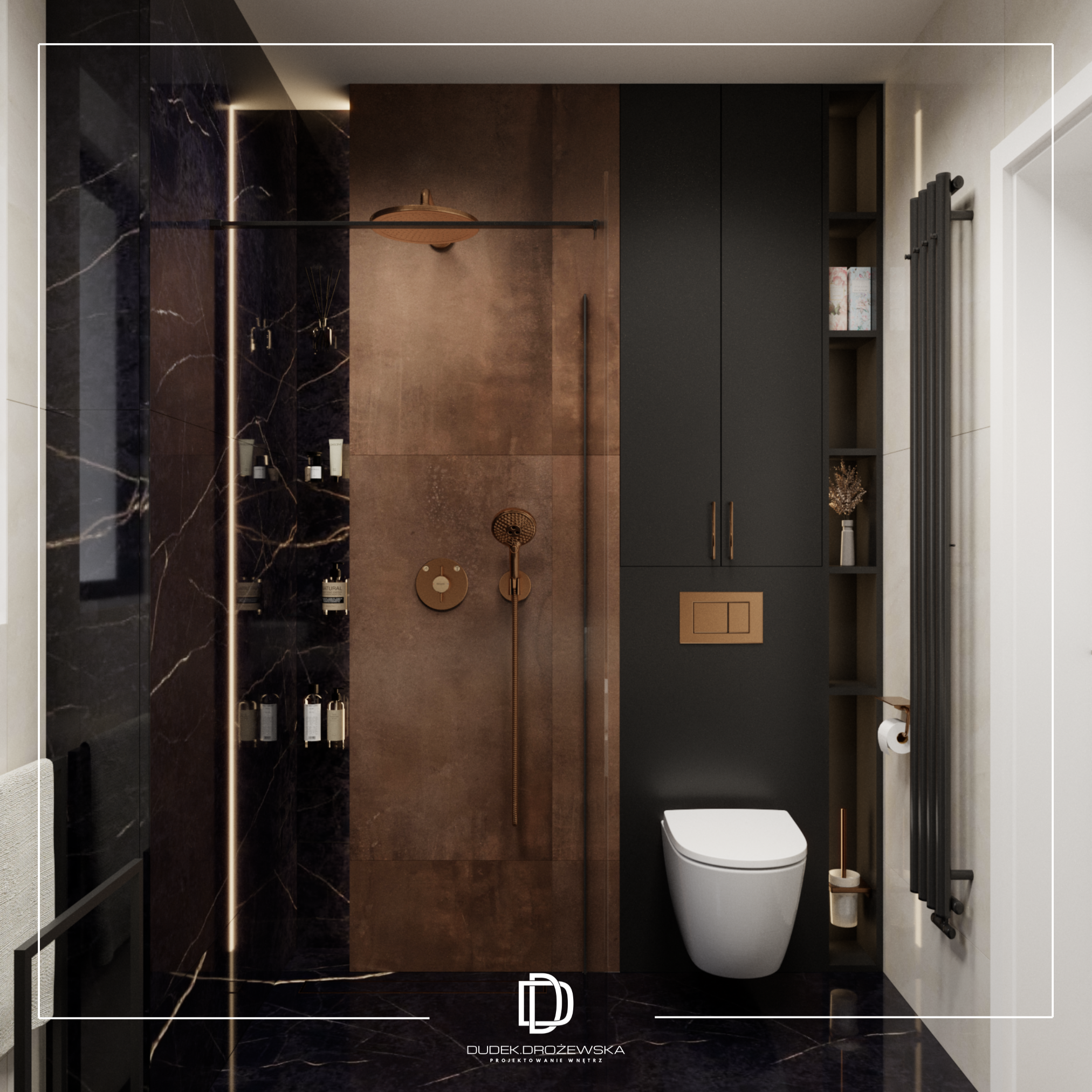 Kolorystycznie wszystko kręci się wokół kontrastu: głęboka czerń (zabudowy, kamień, dodatki) zestawiona z ciepłą bielą i beżem. Do tego dochodzą akcenty złota i miedzi w armaturze i oświetleniu, które dodają elegancji i lekko „hotelowego” klimatu. Duże przeszklenia i jasne powierzchnie sprawiają, że przestrzeń jest lekka mimo mocnych, ciemnych elementów.