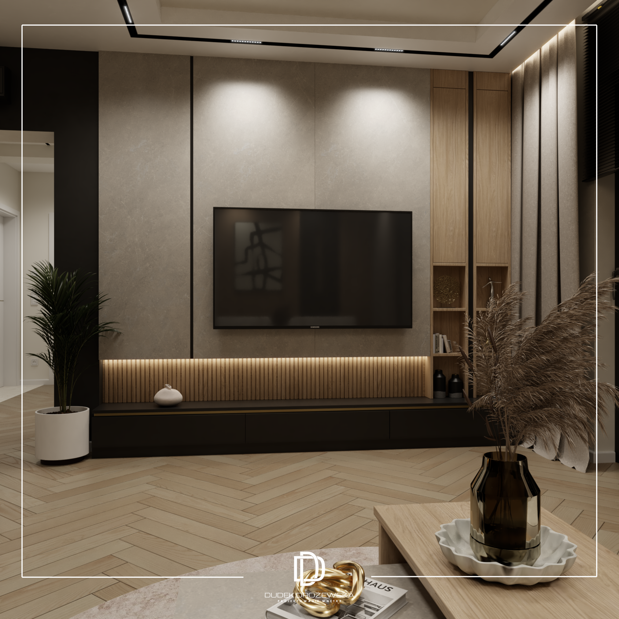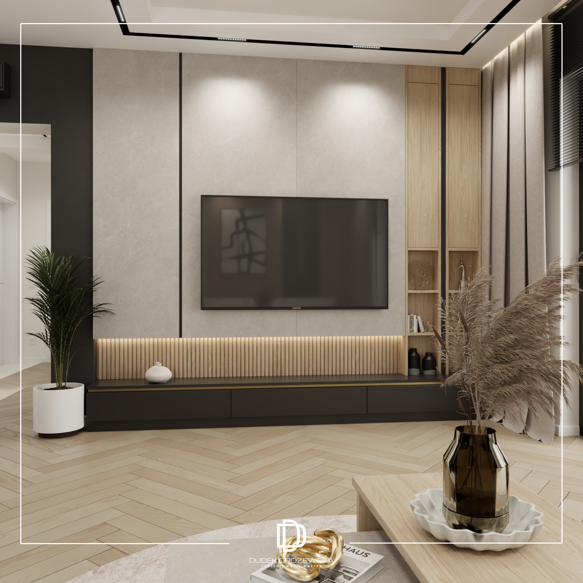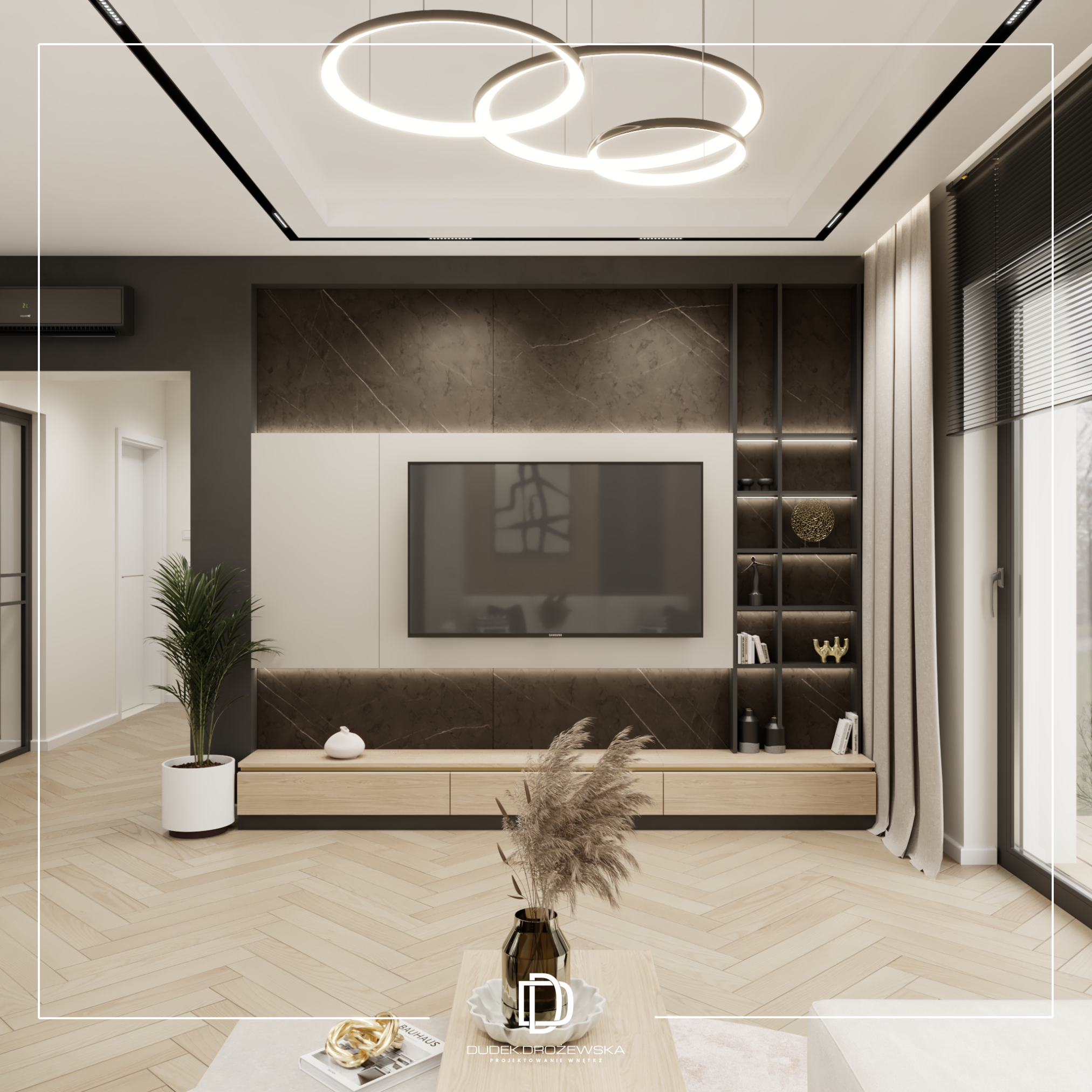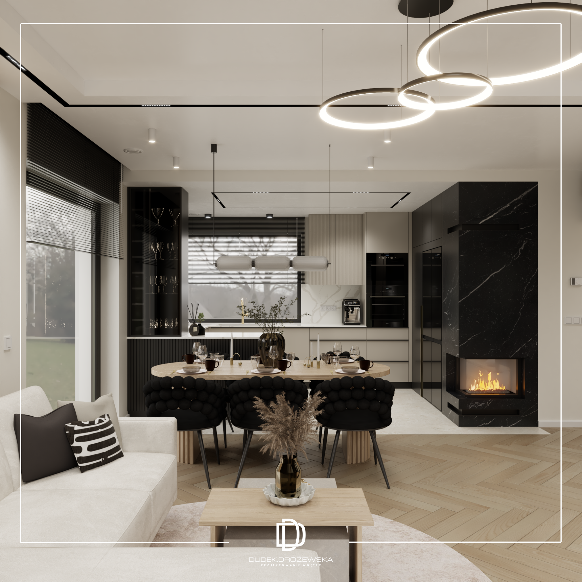 Całość tworzy nowoczesne, eleganckie wnętrze z nutą luksusu, ale bez przesady – takie, w którym po prostu dobrze się żyje na co dzień.