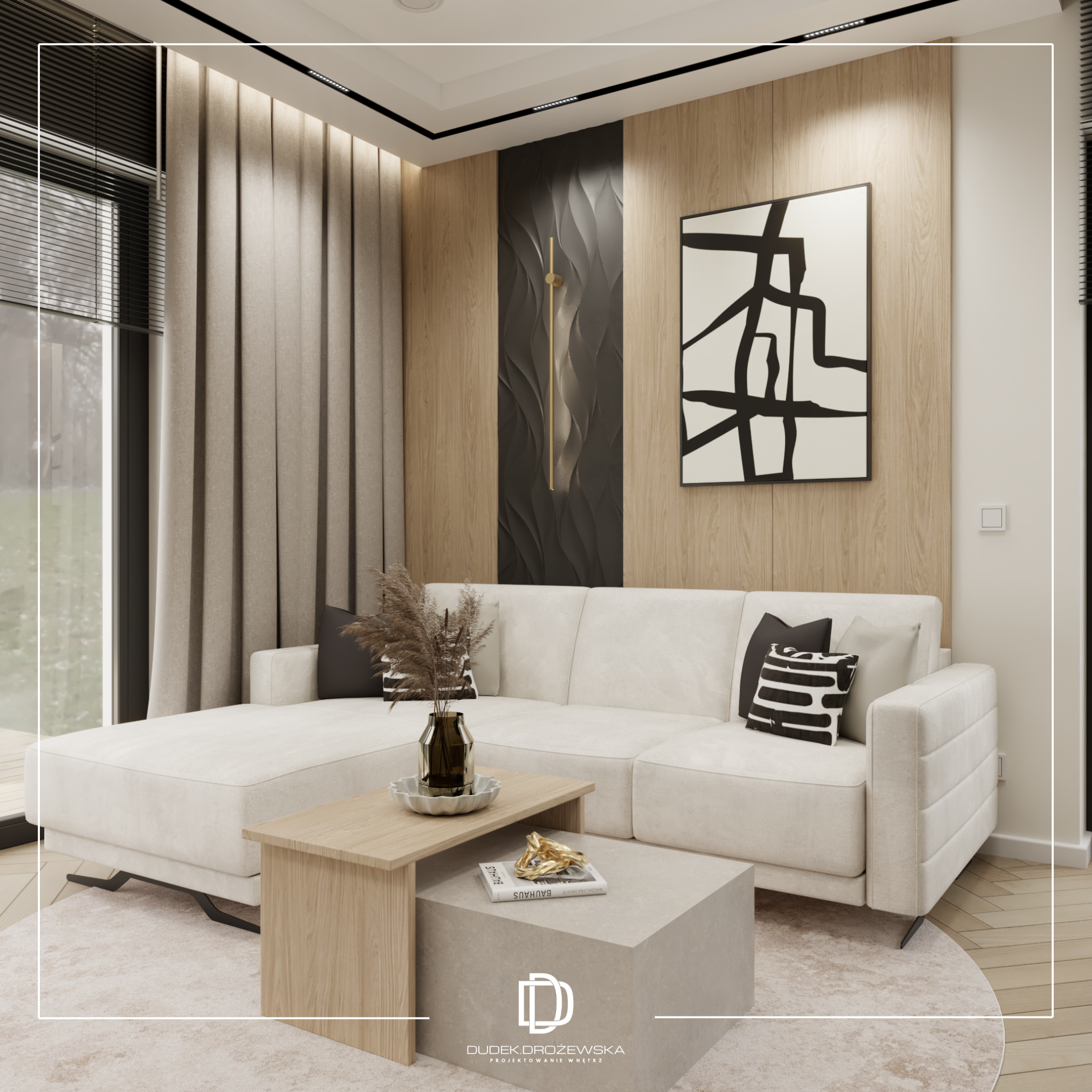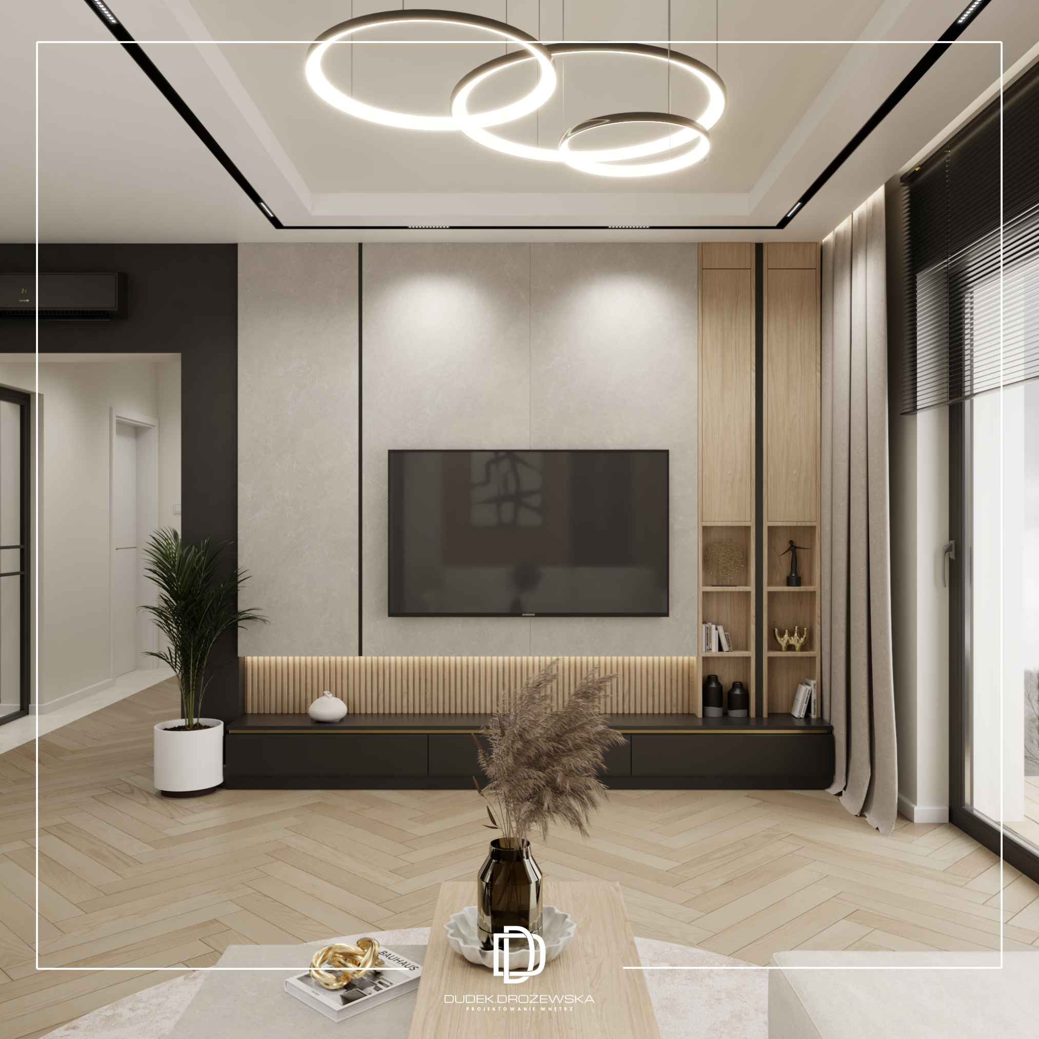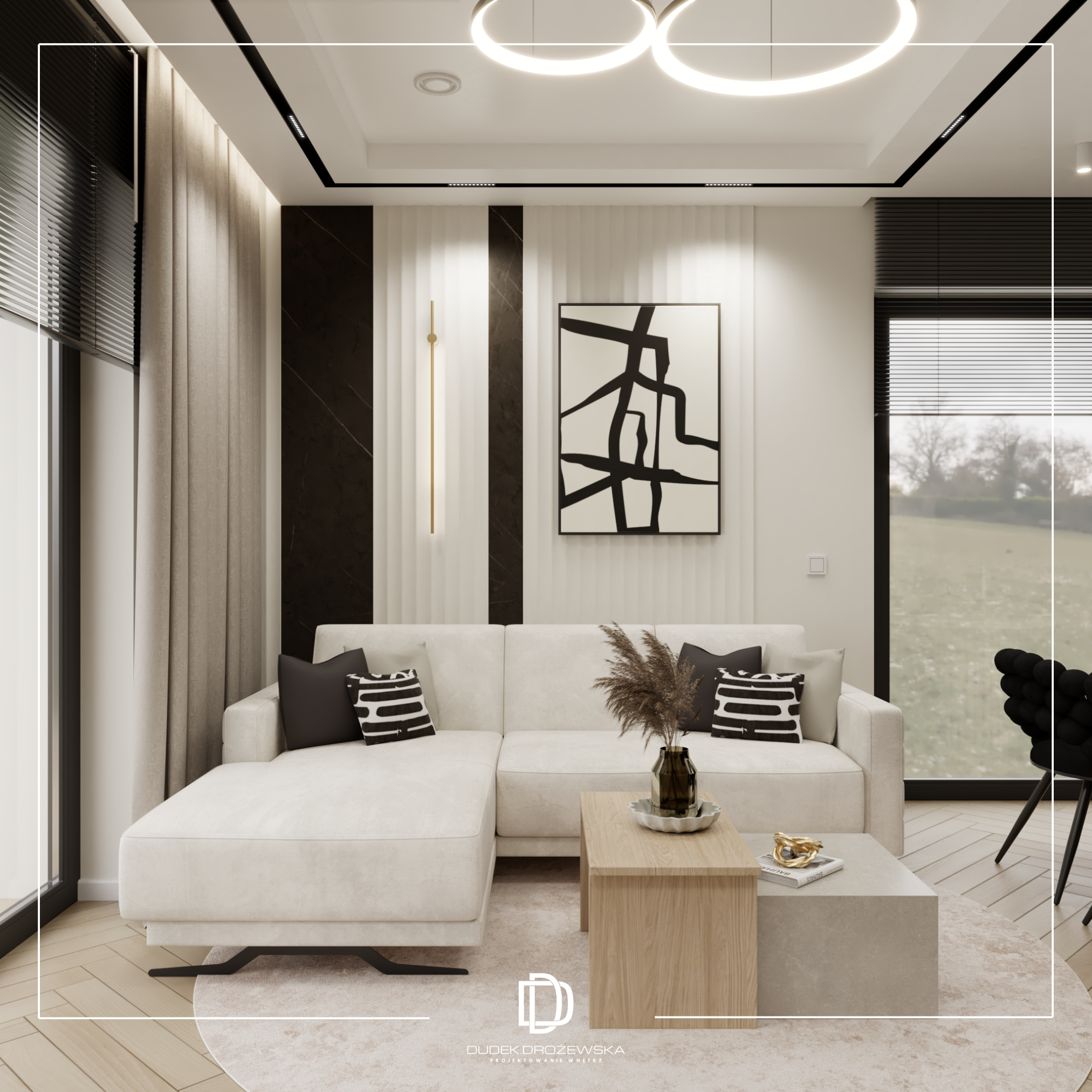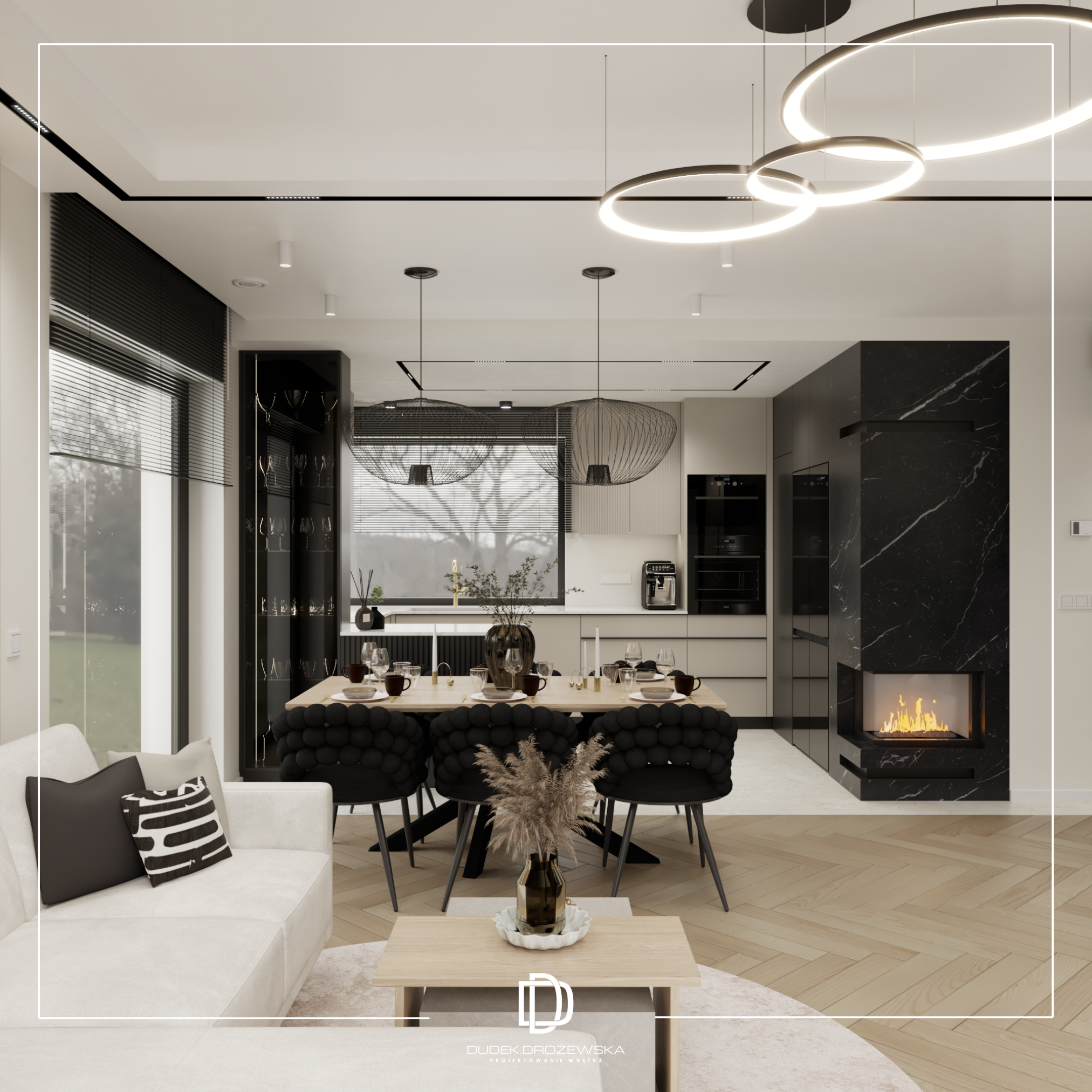 Całość tworzy nowoczesne, eleganckie wnętrze z nutą luksusu, ale bez przesady – takie, w którym po prostu dobrze się żyje na co dzień.