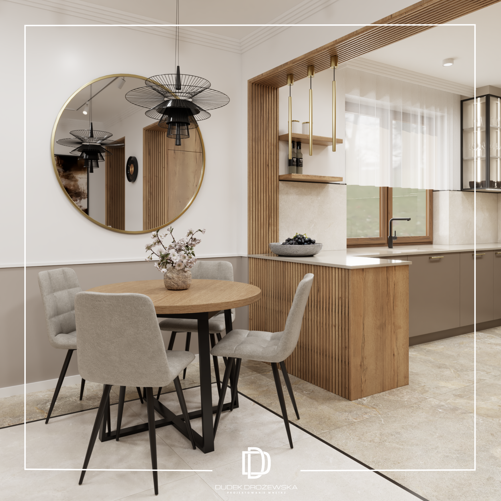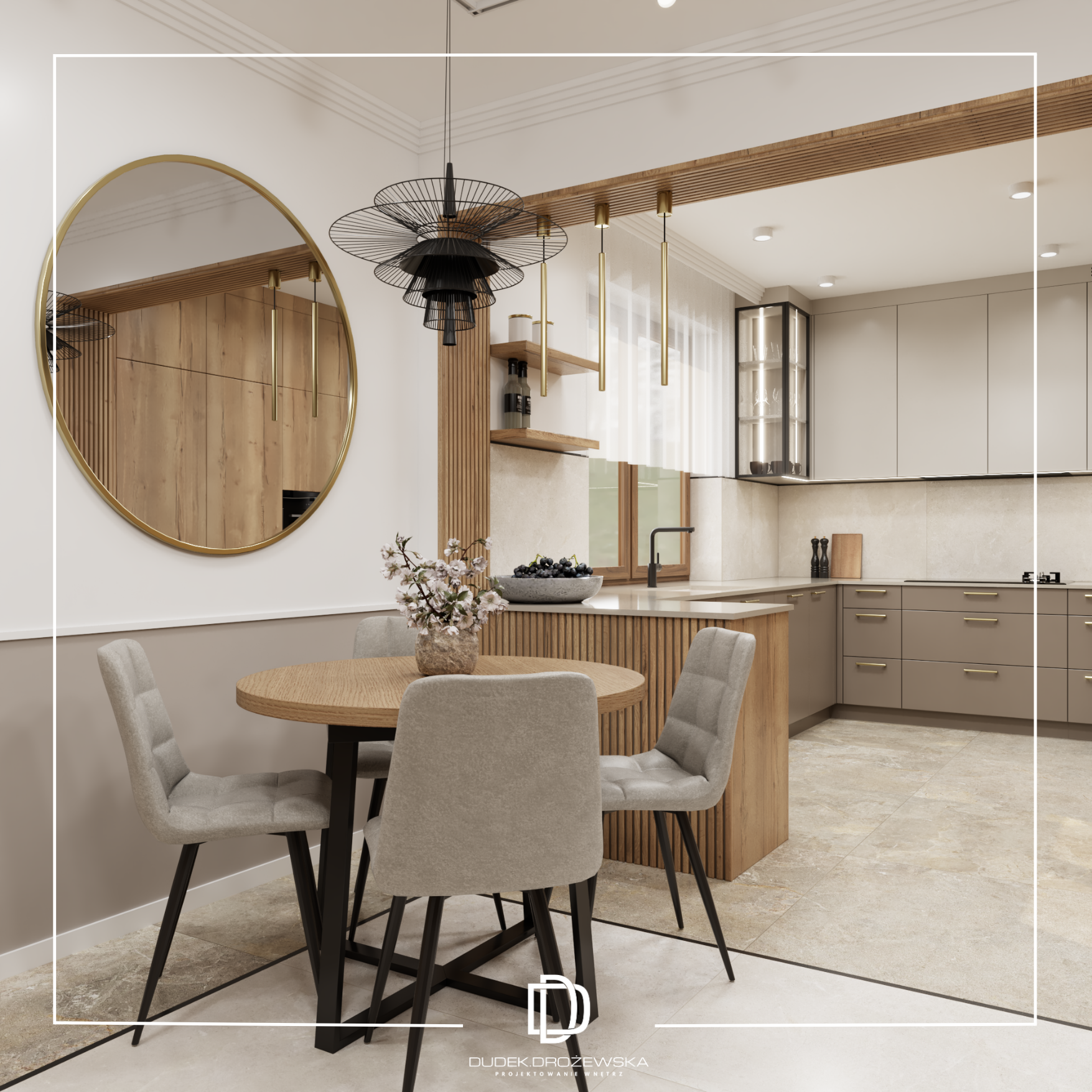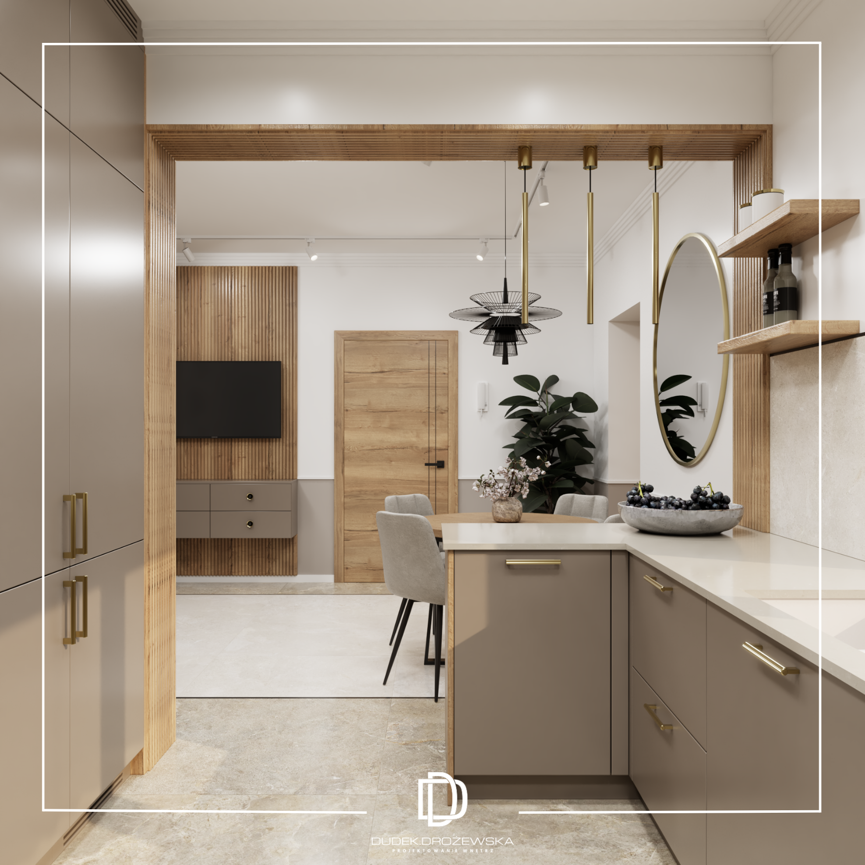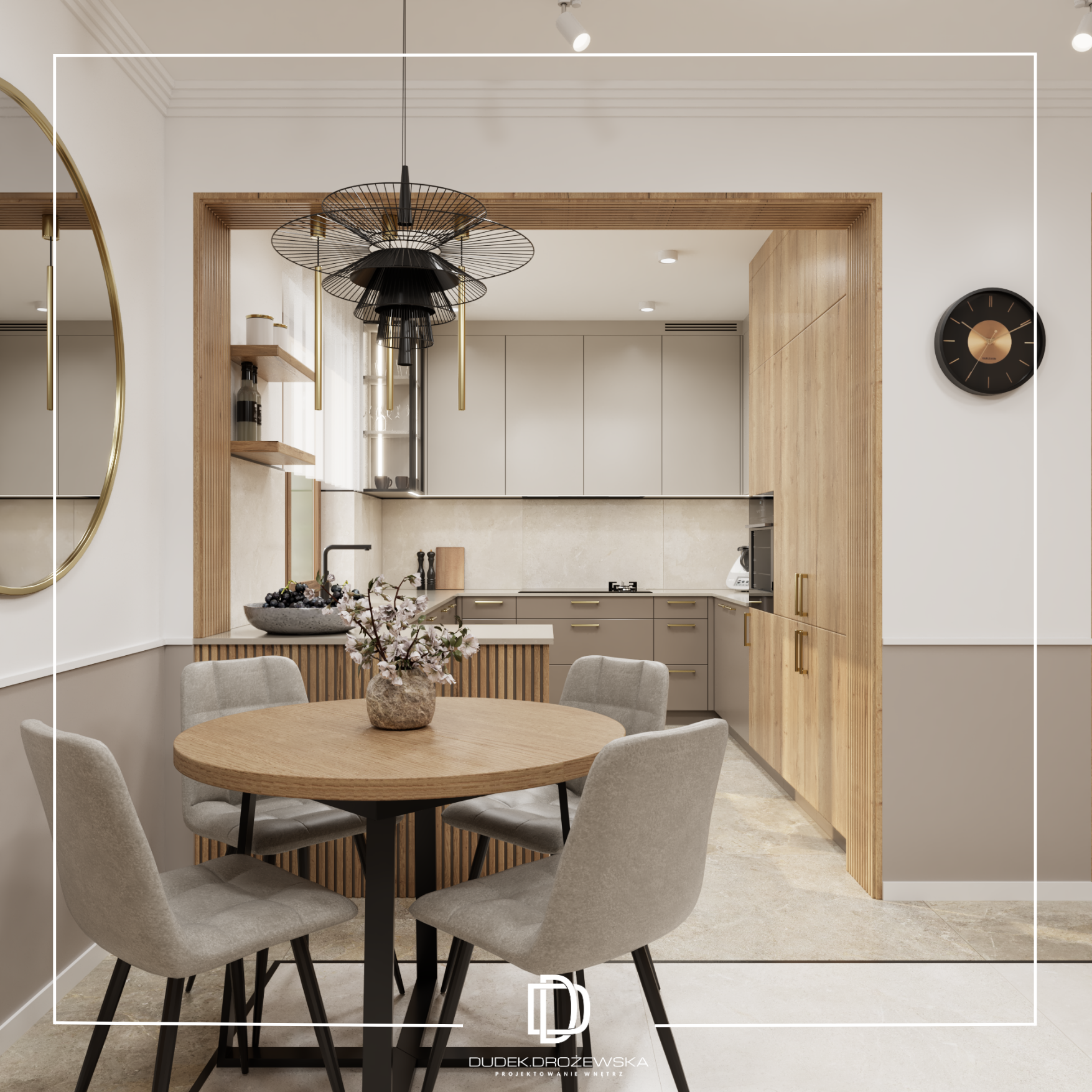 Dominują tu neutralne barwy – beże, biel i odcienie taupe – przełamane akcentami drewna, które ocieplają przestrzeń i nadają jej przytulnego charakteru. Gładkie fronty mebli kuchennych zestawiono z subtelną strukturą pionowych lameli, a całość dopełniają delikatne złote detale oraz transparentne, lekkie oświetlenie. Okrągłe lustro w jadalni optycznie powiększa pomieszczenie, a miękkie, tapicerowane krzesła dodają mu komfortu.