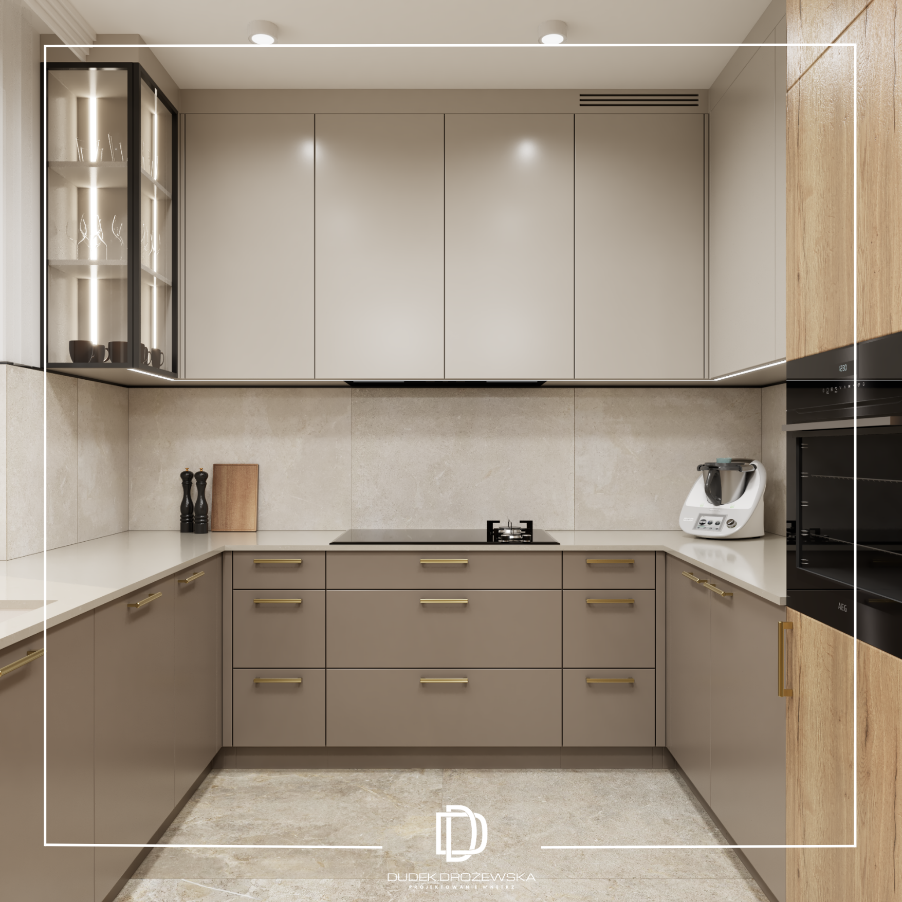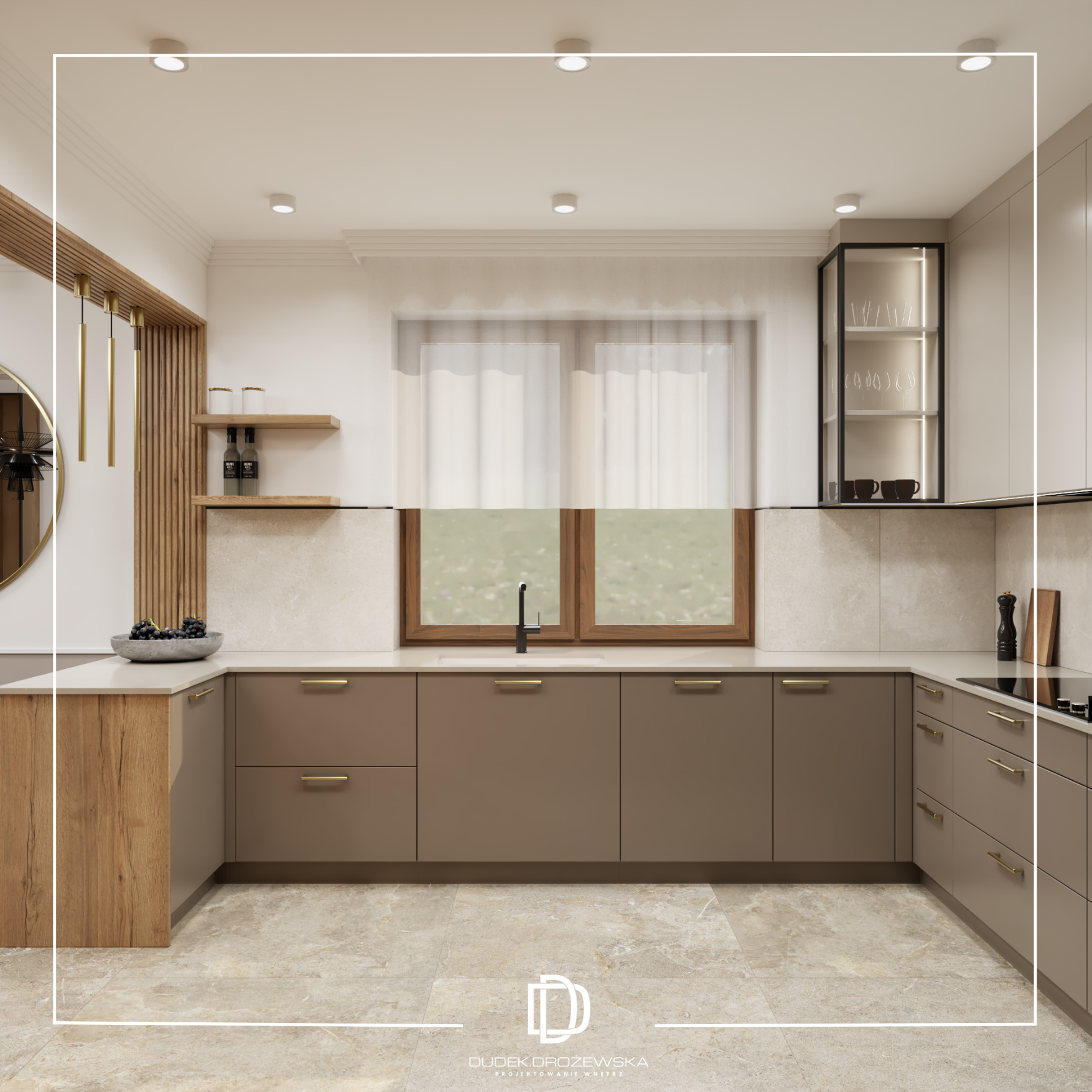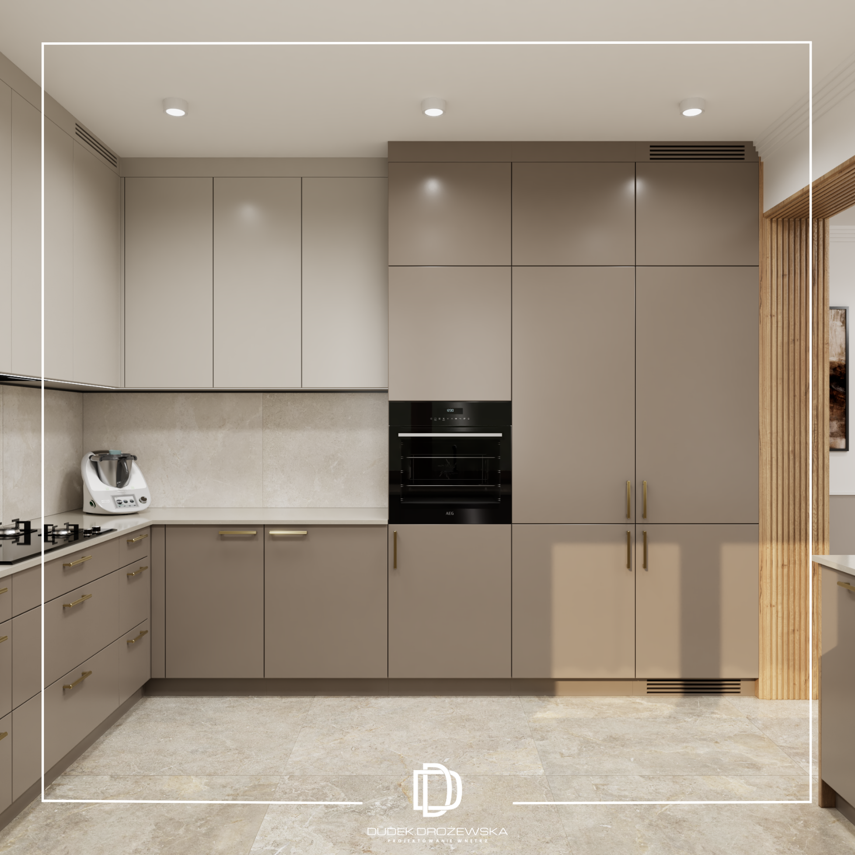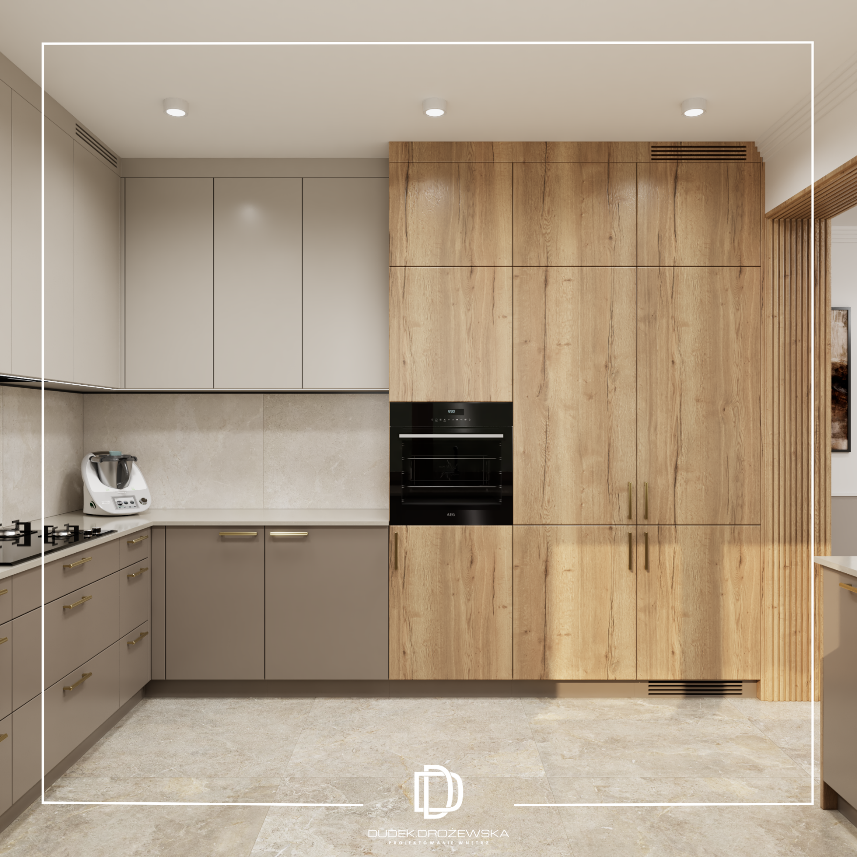 Dominują tu neutralne barwy – beże, biel i odcienie taupe – przełamane akcentami drewna, które ocieplają przestrzeń i nadają jej przytulnego charakteru. Gładkie fronty mebli kuchennych zestawiono z subtelną strukturą pionowych lameli, a całość dopełniają delikatne złote detale oraz transparentne, lekkie oświetlenie. Okrągłe lustro w jadalni optycznie powiększa pomieszczenie, a miękkie, tapicerowane krzesła dodają mu komfortu.