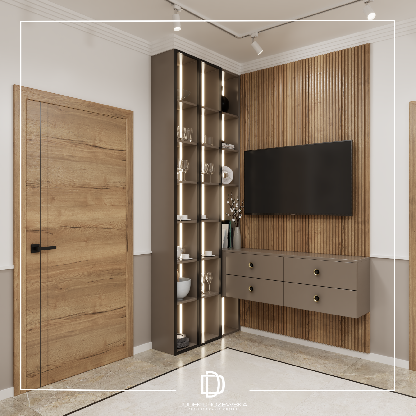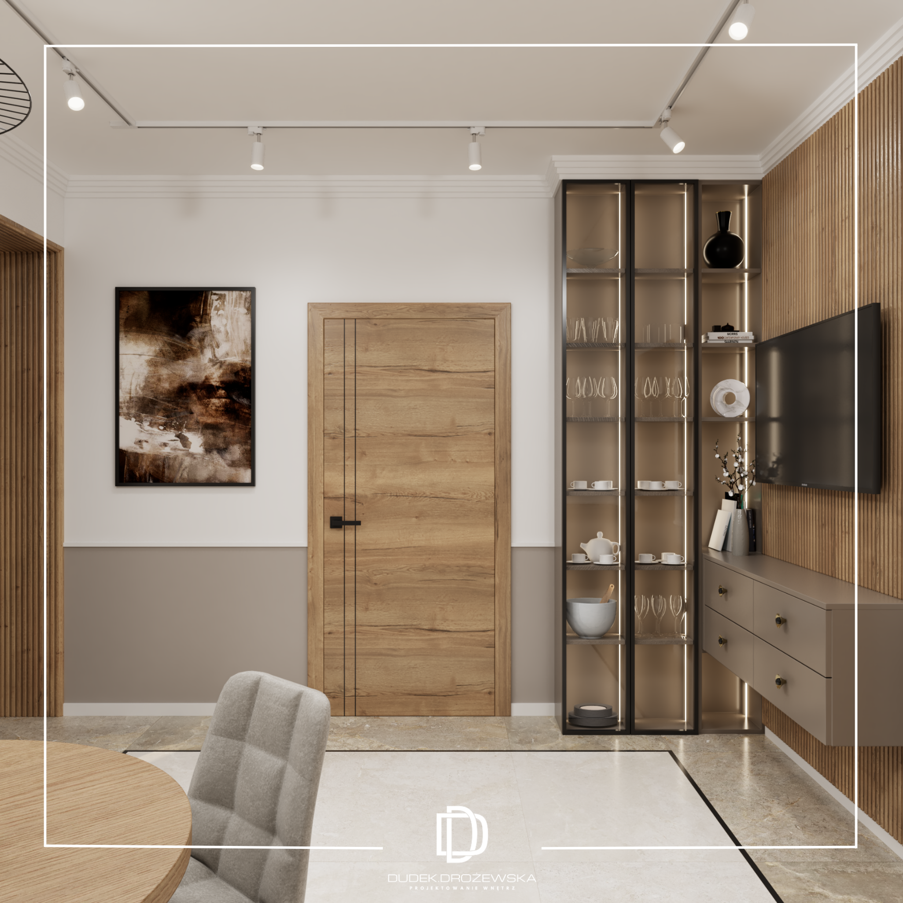 Projekt wyróżnia harmonia form, funkcjonalność oraz ponadczasowa estetyka, tworząca spójną i elegancką przestrzeń dzienną.